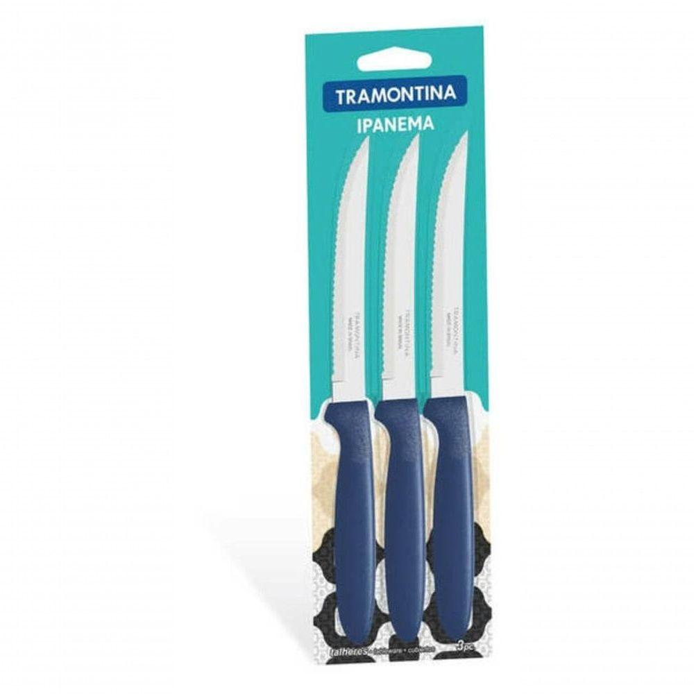 Facas Para Churrasco Tramontina Ipanema 3 Peças AzulAltamente resistentes e duráveis, ;o Conjunto de Facas para Churrasco Tramontina Ipanema com Lâminas em Aço Inox e Cabos de Polipropileno Azul 3 Peças é o conjunto perfeito para ter em sua cozinha. Os talheres do conjunto são produzidos com lâminas em aço inox e cabos de polipropileno na cor azul. Além de serem fáceis de limpar, podem ir à máquina de lavar louças diariamente e possuem um excelente fio de corte. Leve mais cor e estilo para suas refeições e para o seu dia a dia! ;Recomendações de Uso:Antes do Uso: Lave bem as peças e seque-as. Tenha cuidado ao manusear produtos cortantes e perfurantes e mantenha-os fora do alcance das crianças. Para maior durabilidade dos produtos recomenda-se secar bem antes de guardar, mesmo após lavagem em máquina. Para descarte dos produtos e embalagens siga as orientações de reciclagem vigentes.- Foto meramente ilustrativa.Informações Adicionais:- Lâmina em aço inox;- Pode ir à máquina de lavar louças;- A estampagem entre a lâmina e o cabo garantem maior resistêcia ao produto, evitando deformações;- Cabo em polipropileno, mais resistente que, mesmo após inúmeras lavagens, mantém suas características de formato e cor iniciais.