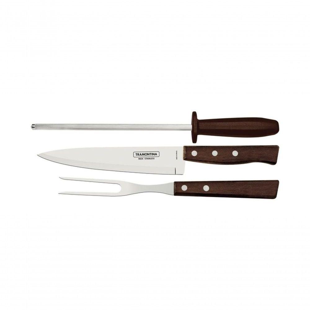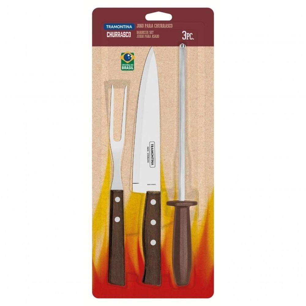 Jogo De Churrasco Tramontina 3 Peças Com Cabos De Madeira NaturalO kit para churrasco Tramontina com lâminas em aço inox e cabos de madeira Natural e Polipropileno 3 Peças da linha Churrasco vem com faca para carne e garfo trinchante com lâminas em aço inox, além de cabos de madeira natural e rebites de alumínio. E para completar, uma chaira com haste em aço carbono cromado e cabo de polipropileno. É o kit básico de qualquer churrasqueiro. Porque todo churrasqueiro que se preze tem que ter sua própria faca Tramontina.Recomendações de Uso:Modo de uso: Tenha cuidado ao manusear produtos cortantes e perfurantes e mantenha-os fora do alcance de crianças. Para garantir a durabilidade dos produtos, recomenda-se secá-los bem após a lavagem.Informações Adicionais:- Faca e Garfo com lâminas de aço inox e Cabos de madeira ipê ficados por rebites- Faca: Lâmina com Maior durabilidade do fio Devido ao tratamento térmico- Garfo: a espessura do aço e a estampagem da lâmina garantem maior resistência ao produto, evitando deformações- Chaira: estrias uniformes,perfeitas para a manutenção do fio das facas- Chaira com revestimento da Haste com cromo-duro que garante Maior resistência contra corrosão e dureza superior que a Lâmina da Faca e Cabo de Polipropileno com boa empunhadura que garante Maior no manuseio.