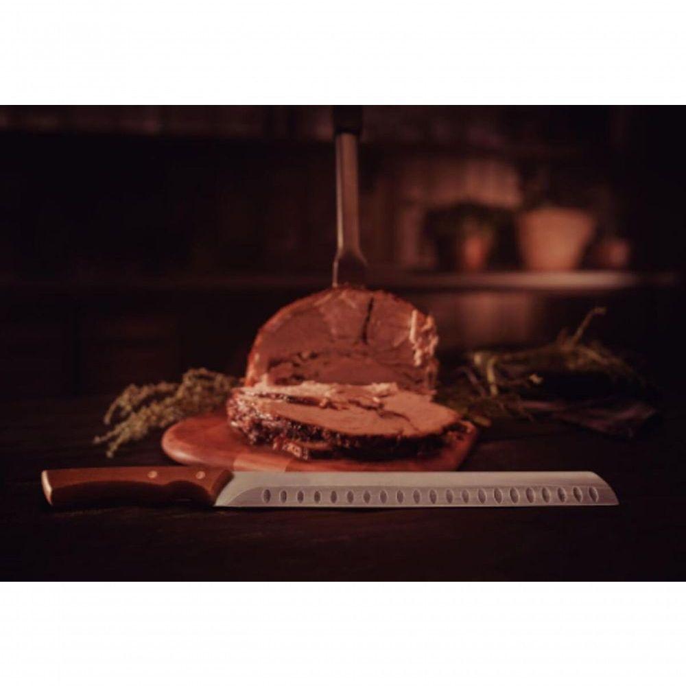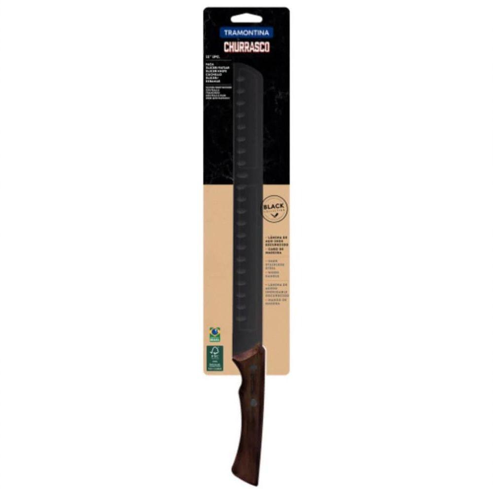 Faca Para Fatiar Tramontina Black 10 Cabo De MadeiraPara preparar aquele steak delicioso e bem fininho, a faca para fatiar Tramontina Churrasco Black com lâmina em aço inox escurecido e cabo de madeira 12 polegadas será a peça perfeita. Desenvolvida com materiais de alta qualidade, ela é ideal para fatiar ou fazer porções de grandes pedaços de carne para seu churrasco e não deixa você passar vergonha, pois conta com sulcos que reduzem o atrito entre a carne e a lâmina. Sua lâmina é desenvolvida em aço inox escurecido e seu cabo é de madeira com rebites, duas características que garantem qualidade, resistência e praticidade durante o uso!Recomendações de Uso:Antes da primeira utilização, lave bem a peça e seque-a.Produto cortante e perfurante: tenha cuidado ao manusear e mantenha fora do alcance das crianção utilize materiais abrasivos para limpeza e para maior durabilidade do produto recomenda-se secar bem antes de guardar. Não utilize em máquinas de descarte do produto e embalagem siga as orientações de reciclagem vigentes.Informações Adicionais:Ideal para fatiar ou porcionar grandes pedaços de âmina de aço inox de madeira.Rebites aço inox escurecido.
