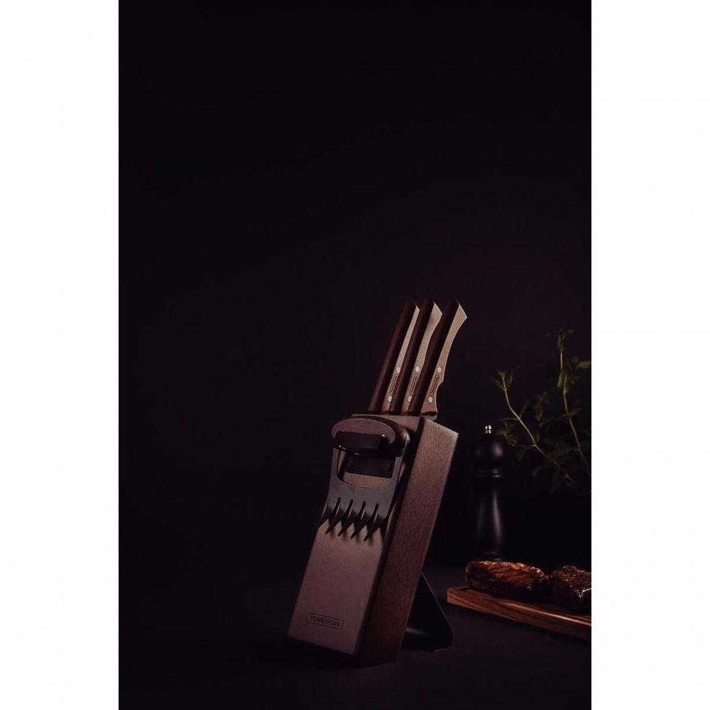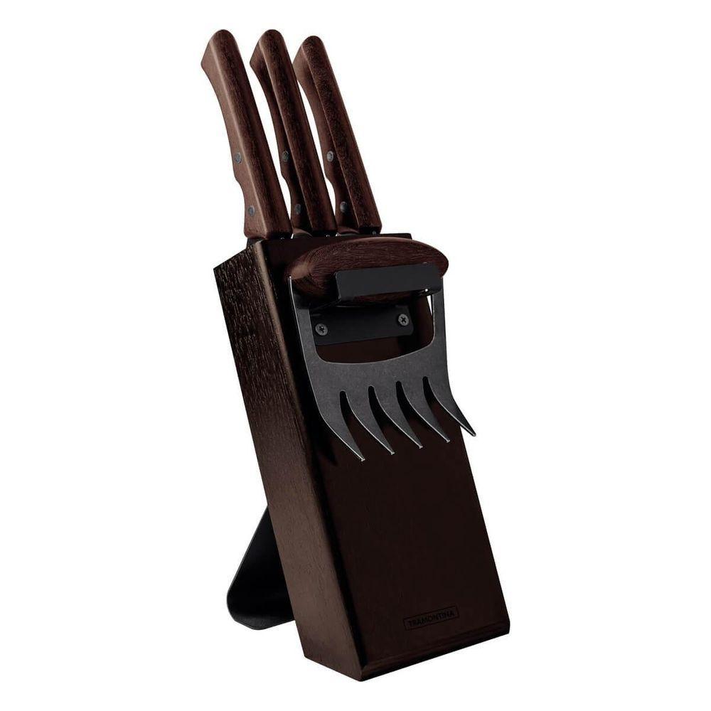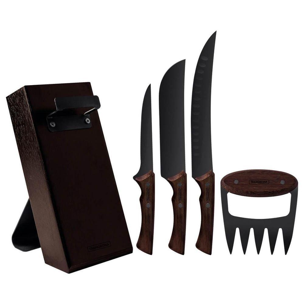 Jogo Para Churrasco Tramontina Black 5 Peças Cabos Em MadeiraPara preparar, cortar e servir aquela carne assada deliciosa, o Conjunto para churrasco Tramontina Churrasco Black com lâminas de aço inox escurecido e cabos de madeira 05 peças. Composto por três facas de funções e uma garra multiuso garantirá maior praticidade e versatilidade para seu dia a dia. Suas peças são desenvolvidas com lâminas em aço inox escurecido e contam com cabos de madeira, rebites de aço inox escurecido e design anatômico, que tornam o uso muito mais firme e confortável. Além de todas essas características, as facas são resistentes, duráveis e vem com suporte de madeira que garante maior organização e funcionalidade na hora de guardá-las!Recomendações de Uso:Antes do Uso: Lave bem as peças e seque-as.Modo de Uso: Tenha cuidado ao manusear e mantenha fora do alcance das crianças. Para maior durabilidade dos produtos recomenda-se lavar manualmente e secá-los bem antes de guardar. Para limpeza do suporte, utilize um pano umedecido em água na área externa e em seguida um pano seco. Para descarte dos produtos e embalagem siga as orientações de reciclagem vigentes.- Foto meramente ilustrativa.Informações Adicionais:- Resistentes e robustas;- Rebites aço inox escurecido;- Suporte para facas de madeira;- Lâminas de aço inox escurecido;- Cabos de madeira com design anatômico que tornam o uso muito mais confortável.