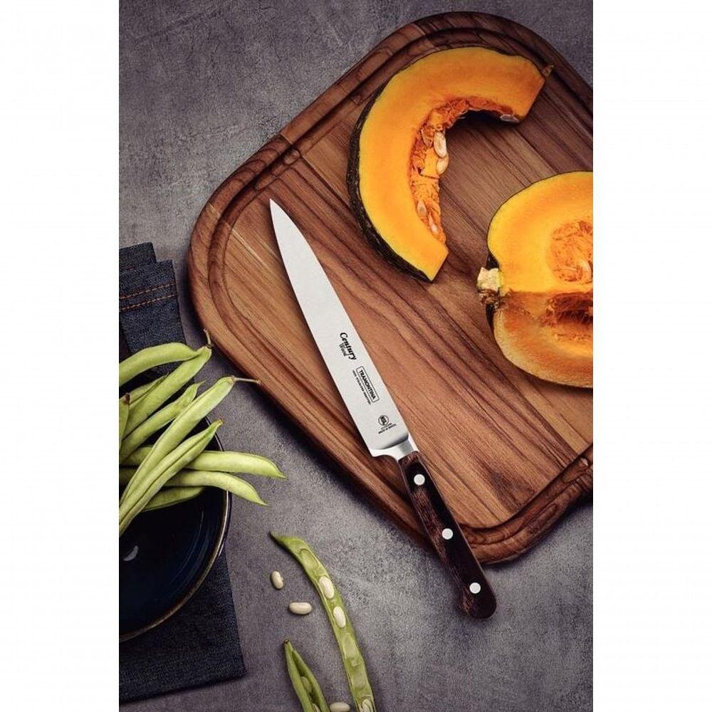 Faca Utility Tramontina 6 Century Wood CastanhoCom a Faca Utility Tramontina Century Wood, de lâmina em aço inox e cabo de madeira tratada castanho de 6 polegadas, você tem em mãos a combinação perfeita de beleza, durabilidade e desempenho na cozinha. Sua lâmina forjada em aço inox especial garante cortes precisos e duradouros, oferecendo alto poder de corte e excepcional durabilidade do fio. O cabo de madeira tratada, fixado com rebites de alumínio, acrescenta um toque de elegância à sua rotina culinária, além de proporcionar um manuseio confortável e . Esta faca versátil é também prática, podendo ser levada à máquina de lavar louças, facilitando seu dia a dia. Desenvolvida com precisão e cuidado, a Faca Utility Century Wood é uma verdadeira obra-prima culinária, ideal para profissionais e entusiastas da gastronomia. Seja cortando, fatiando ou picando, você experimentará uma performance incomparável com esta faca de alta qualidade!Recomendações de Uso:Modo de Uso: Antes da primeira utilização, lave bem a peça e seque-a. Produto cortante e perfurante: tenha cuidado ao manusear e mantenha fora do alcance das crianças. Para maior durabilidade do produto recomenda-se secar bem antes de guardar, mesmo após lavagem em máquina. Recomenda-se o uso de tábuas de polipropileno ou madeira da Tramontina para maior durabilidade do fio da faca. Não é indicado o uso da faca para o corte de alimentos congelados. Para descarte dos produtos e embalagens siga as orientações de reciclagem vigentes.- Foto meramente ilustrativa.Informações Adicionais:- Resistente a impactos e a altas temperaturas;- Cabo de madeira tratada com rebites de aço inox;- Pode ir à máquina de lavar louças facilitando seu dia a dia;- Com ponta em formato de espada, auxilia na abertura e na perfuração dos alimentos;- A lâmina forjada de aço inox especial garante um fio com maior durabilidade e precisão.