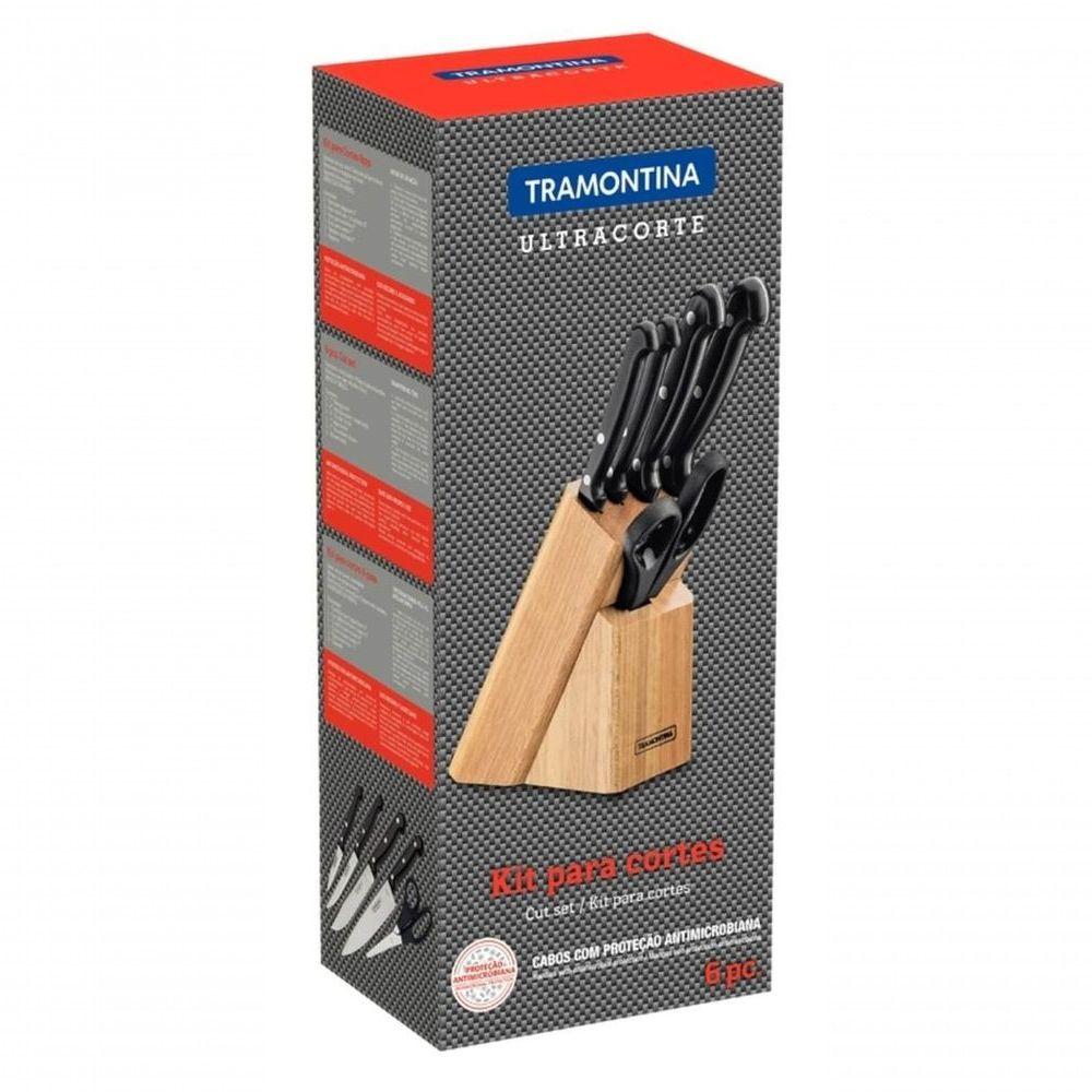 Jogo De Facas Tramontina Ultracorte 6 Peças Com SuporteO Jogo de Facas Tramontina Ultracorte com Lâminas em Aço Inox Cabos de Polipropileno Preto e Suporte de Madeira 6 Peças da Linha Ultracorte vai deixar sua cozinha mais sofisticada e com qualidade. Com um charmoso suporte de madeira, ele organiza as 5 peças deixando sua cozinha mais elegante. As lâminas de aço inox possuem tratamento térmico, que dão maior durabilidade ao fio. Os cabos em polipropileno na cor preta, possuem proteção antimicrobiana, que inibem o crescimento de bactérias e fungos. Fáceis de guardar e limpar, podem ser utilizadas na máquina de lavar louças.Recomendações de Uso:Antes do uso: Antes de utilizar o , remova as eventuais etiquetas e lave-o com água quente, detergente e enxugue-a de uso: Após cada uso, lave o produto. Durante a lavagem use somente esponja macia e detergente, outros tipos de produtos, como palha de aço, poderão riscar a superfície do produto. Enxágue bem a peça a fim de remover totalmente os resíduos dos produtos de limpeza. Pode ser lavada à máquina de lavar louças. Após a lavagem enxugue-o bem com toalha de pano. cuidado ao manusear produtos cortantes e perfurantes e mantenha-os fora do alcance de crianç meramente ilustrativaEmbalagem litografada.Informações Adicionais:Lâminas fabricadas com aço inox com maior durabilidade do fio devido ao tratamento té das facas de polipropileno com proteção antibacteriana, inibindo o crescimento de fungos e bacté da Tesoura em suporte de madeira garante maior beleza e quando os utensílios estão guardados.