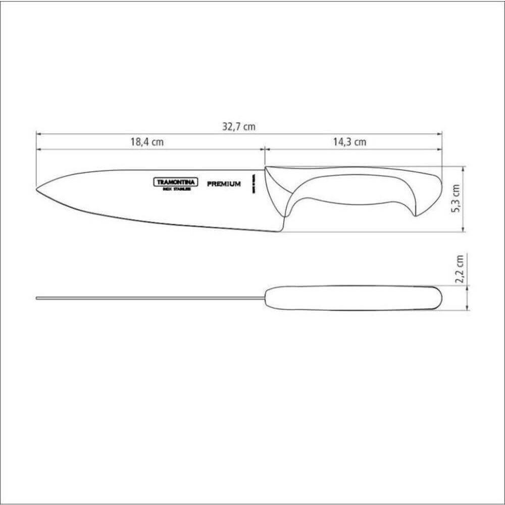 Faca Chef Tramontina Premium Com Lâmina Em Aço Inox E Cabo De Polipropileno Branco 8"As facas da linha Premium Tramontina tem lâmina de aço inoxidável e cabo anatômico, tornado seu uso diário fácil e prático.- Linha PREMIUM.Recomendações de Uso:Antes do uso: Antes de utilizar o , remova as eventuais etiquetas e lave-o com água quente e de uso:Durante a lavagem use somente esponja macia, outros tipos de produtos, como palha de aço, poderão riscar ou prejudicar o brilho do aço inox. Enxágue bem a peça a fim de remover totalmente os resíduos dos produtos de limpeza, que por serem abrasivos, podem danificar o inox. Após a lavagem enxugue a faca, pois as substâncias químicas contidas na água poderão causar manchas. Sempre que possível use água quente, pois renova o brilho do talher. Evite o das peças com superfícies quentes, pois podem provocar a descoloração do produto. Quando usar a máquina de lavar louça, recomendamos retirar o talher logo que tenha terminado o ciclo enxaguar, a fim de que os mesmos sejam secados manualmente.- Tenha cuidado ao Manusear produtos cortantes e perfurantes e mantenha-os fora do alcance de crianças.- Foto meramente ilustrativa.- Embalagem blister.Informações Adicionais:- Lâmina fabricada em aço inox inoxidável semi desbastada, o que proporciona um excelente corte e rendimento do fio.- Cabo em polipropileno.- Possui cabo anatômico e texturizado, facilitando o manuseio e evitando que a mão escorregue, oferecendo mais conforto e segurançana hora do corte.- Para evitar a formação de folgas ou frestas entre as partes e a retenção de resíduos, além de facilitar a limpeza, o cabo é injetado diretamente sobre a espiga da própria lâmina.
