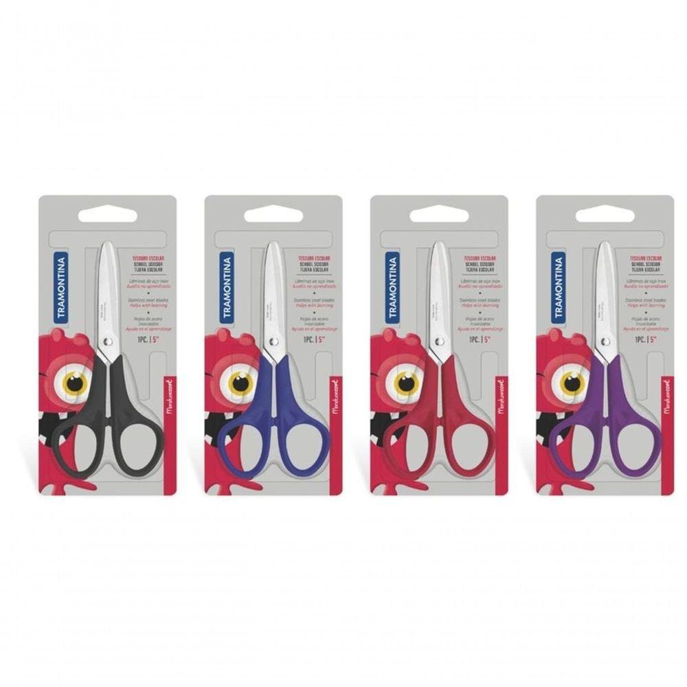 Tesoura Escolar Tramontina Supercort Monster Em Inox 5"Em casa, ela é item básico. Naescola, é cheia de estilo. No trabalho, tem performance avançada. A linha detesouras Tramontina oferece um modelo para cada ocasião, com diferentes corespara, literalmente, cortar a monotonia.Recomendações de Uso:Antes do uso: remova as eventuais etiquetas e lave usando apenas uma esponja macia, sabão ou detergente neutro. Outros tipos de produtos, como palha de aço, poderão riscar ou prejudicar o acabamento da peça. Enxágue bem a peça a fim de remover totalmente os resíduos dos produtos de limpeza que, por serem abrasivos, podem danificar o inox. Após a lavagem enxaguar e secar bem a peça, caso contrário, as substâncias químicas da água (cloro) poderão causar manchas. Evite o direto da peça com superfícies quentes, pois poderá provocar deformações ao produto. Quando usar a máquina de lavar louça, recomendamos retirar o utensílio logo que tenha terminado o ciclo enxaguar, a fim de que o mesmo seja secado manualmente.- Tenha cuidado ao Manusear produtos cortantes e perfurantes e mantenha-os fora do alcance de crianças.- Foto meramente ilustrativa.Informações Adicionais:- Lâmina em aço inox.- Lâmina com pontas arredondadas. - Lâminas fixadas por rebites. - Cabos anatômicos de polipropileno. - Pode ir a máquina de lavar louças. - Aprovado conforme a Norma ABNT NBR 15236.