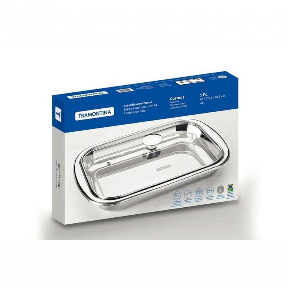 Assadeira Retangular Tramontina Cosmos 43cm Em Aço Inox Com Tampa De VidroLeve suas receitas a um nível de sofisticação e sabor! Ideal para quem valoriza a funcionalidade e o design, esta assadeira é perfeita tanto para assar quanto para servir. Feita em aço inox de alta durabilidade, ela é resistente à corrosão e garante que seus pratos sejam preparados com a qualidade que você merece. O acabamento em brilho elegante faz com que ela se destaque à mesa, adicionando um toque de requinte a qualquer refeição. E não é só sobre beleza! A tampa de vidro transparente é um verdadeiro diferencial, permitindo acompanhar o preparo dos alimentos sem perder o calor ou o sabor. Seja para um almoço em família ou um jantar especial com amigos, essa assadeira oferece versatilidade e praticidade para todos os momentos. Transforme suas experiências na cozinha e surpreenda a todos com resultados deliciosos e apresentações impecáveis. Afinal, você merece o melhor!Recomendações de Uso:Antes do uso: Antes de utilizar o , remova as eventuais etiquetas e lave-o com água quente e de uso:Durante a lavagem use somente esponja macia, outros tipos de produtos, como palha de aço, poderão riscar ou prejudicar o brilho do produto. Enxágue bem a peça a fim de remover totalmente os resíduos dos produtos de limpeza, que por serem abrasivos, podem danificar o inox. Após a lavagem enxugue-o, pois as substâncias químicas contidas na água poderão causar manchas. Sempre que possível use água quente, pois renova o brilho do produto. Evite o da peça com superfícies quentes, pois podem provocar a descoloração do produto. Quando usar a máquina de lavar louça, recomendamos retirar o produto logo que tenha terminado o ciclo enxaguar, a fim de que o mesmo seja secado manualmente.- Foto meramente ilustrativa.- Embalagem E ADEQUADOInformações Adicionais:Impressione amigos e familiares com a Assadeira Tramontina Cosmos Retangular em Aço Inox com Tampa de Vidro 43 cm. Perfeita para assar e servir, encaixa-se em diferentes exigências que você encontrar na cozinha. Possui a alta durabilidade do aço inox e encanta com seu elegante acabamento em brilho, sendo uma ótima opção para ser servida à mesa. Acompanha tampa de vidro transparente que proporciona um preparo mais funcional, pois você consegue visualizar os alimentos.