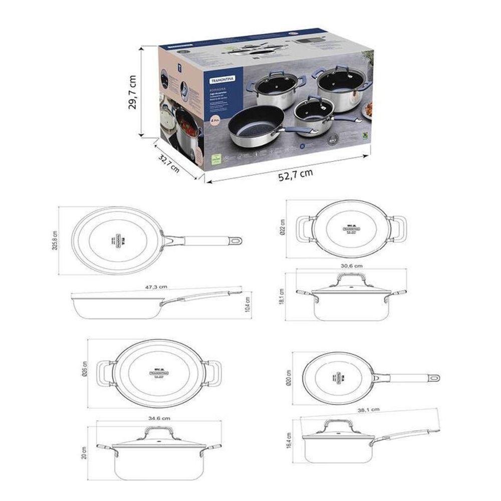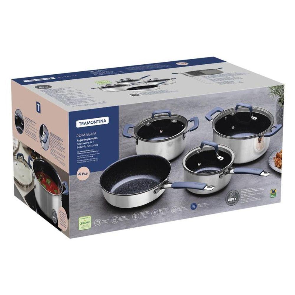 Jogo De Panelas Tramontina Romagna Aço Inox E Alumínio Interno Cerâmico Black Stone 4 PeçasO jogo de panelas Tramontina Romagna une eficiência e praticidade para quem valoriza um preparo preciso e ágil. Com tecnologia Biply Induction, a fusão entre aço inox e alumínio garante um aquecimento rápido, uniforme e econômico, reduzindo o consumo de energia. O revestimento interno cerâmico Black Stone facilita a limpeza, tornando o dia a dia ainda mais descomplicado. O conjunto conta com quatro peças essenciais para diversas receitas: frigideira funda (24 cm), panela (18 cm) e duas caçarolas (20 cm e 24 cm). Os cabos com proteção em silicone oferecem mais e conforto durante o manuseio, enquanto a compatibilidade com todos os tipos de fogões – indução, gás, elétrico e vitrocerâmico – traz total versatilidade. Eleve sua cozinha a um nível com a qualidade e inovação Tramontina!Recomendações de Uso:Modo de Uso: ;O uso prolongado em temperaturas altas pode causar o amarelamento da superfície em aço inox. Para que a panela de aço inox fique sempre bonita e com brilho, recomendamos que seja lavada somente com detergente neutro e esponja. Nas partes foscas da panela pode-se utilizar o lado mais abrasivo da esponja com saponáceo líquido, para remover as manchas mais difíceis, ou ainda, pode ser usada a pasta para polimento e remoção de manchas da Tramontina. Depois da lavagem, enxágue a panela com água quente e seque-a imediatamente, para que ela mantenha o brilho , pois o cloro e as substâncias contidas na água podem deixar manchas na panela.- Foto meramente ilustrativa.Informações Adicionais:- Corpo de aço inox + alumínio;- Revestimento interno cerâmico;- Com espessura de 2,7 mm de alumínio e 0,6 mm de aço inox;- Para evitar que os alimentos grudem, deve-se untar o utensílio;- Tecnologia Biply: Dupla camada: durabilidade do aço inox + eficiência do alumínio;- Resiste à máquina de lavar louças, embora diferentes detergentes para uso nestas máquinas podem ser mais agressivos e acelerar o desgaste de seu utensílio. ;