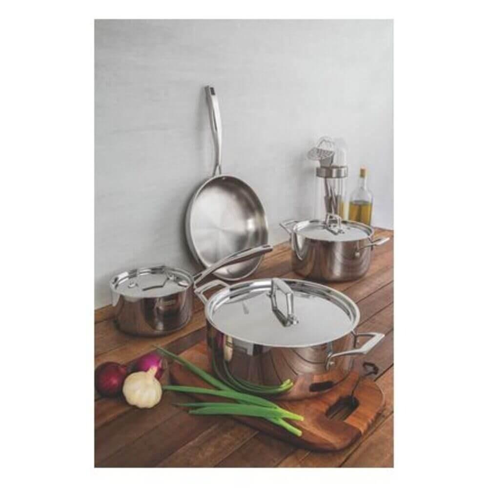 Caçarola Funda Tramontina Grano 20cm Em Inox Com Corpo TriploBeleza que vai da cozinha à mesa. Com a Caçarola Tramontina Funda em Aço Inox Corpo Triplo com Tampa e Alças 20 cm de diâmetro 3,8 L da linha Grano você poderá preparar suas receitas com muita praticidade, garantindo a qualidade dos seus pratos. Totalmente produzida em aço inox, ela não solta resíduos nos alimentos, mantendo-os saudáveis e saborosos. A Caçarola Tramontina une desgin com tecnologia de ponta de fabricação, proporcionando para o seu dia a dia corpo triplo (aço inox + alumínio + aço inox), que permite um cozimento mais rápido e uniforme, pois distribui o calor igualmente. Funcionalidade e beleza que não podem faltar na sua rotina.Recomendações de Uso:A capacidade volumétrica máxima para cozimento é de 3/4 da capacidade total da peça. Use uma fonte de calor brando para evitar que o alimento grude no fundo da caçarola. O fundo triplo distribui uniformemente o calor, não sendo necessário o fogo alto. E, além disso, você economiza energia. Quando a caçarola for utilizada no fogão a gás, a chama não deve ultrapassar a base da caçarola. No caso de uso de chapa elétrica, a chapa deverá ter diâmetro igual ou inferior ao da caçarola. Sempre dissolva o sal em água fervendo ou com os alimentos, mexendo os ingredientes no início do ão aqueça o alimento colocando uma caçarola do mesmo diâmetro sobre a outra. Esse procedimento é perigoso, pois cria vácuo e impossibilita a retirada do mesmo. Alguns alimentos que possuem amido, como massa e arroz, poderão deixar manchas na parte interna da caçarola durante o cozimento. Para remover facilmente as manchas, passe um pano umedecido com suco de limão ou vinagre, ou use a pasta de polir inox Tramontina. Evite deixar alimento na caçarola por muito tempo; o sal também pode provocar que a caçarola de aço inox fique sempre bonita e com brilho, recomendamos que seja lavada somente com detergente e esponja. A Tramontina desenvolveu uma pasta especial para polir e remover manchas nos produtos de aço inoxidável, que está disponível nos principais pontos de venda. Depois da lavagem, sempre que possível, enxágue a caçarola com água quente e seque-a imediatamente, para que ela mantenha o brilho , pois o cloro e as substâncias contidas na água podem deixar manchas na cação deixe a caçarola vazia sobre uma fonte de calor. Deixe as caçarolas quentes somente em superfícies resistentes ao calor. Os cabos de inox aquecem durante o cozimento, por isso use luvas durante o manuseio.Informações Adicionais:Mais saudável: por ser feita de aço inoxidável, a caçarola Tramontina não libera nenhum tipo de resíduo nas suas receitas.Fácil de usar: uma caçarola prática para todas as suas receitas e que faz bonito em qualquer tipo de fogão: gás, elétrico, vitrocerâmico e indução. Ainda possui tampa com saída de vapor e encaixe perfeito.Mais durável: o inox Tramontina é uma matéria-prima nobre, resistente e que vai fazer bonito por muito mais tempo na cozinha.Economiza tempo e energia: o segredo está no corpo triplo (aço inox + alumínio + aço inox), que distribui o calor uniformemente, proporcionando um cozimento mais rápido. Por isso, você pode manter o fogo baixo durante todo o preparo e, assim, poupar energia. Além disso, a caçarola toda em aço inox pode ir ao forno para gratinar ou finalizar pratos, na temperatura máxima de 260°C.Fácil de limpar: deixar sua caçarola brilhando é simples, você só precisa de água, sabão e uma esponja macia. Se preferir, é só colocar na máquina de lavar.