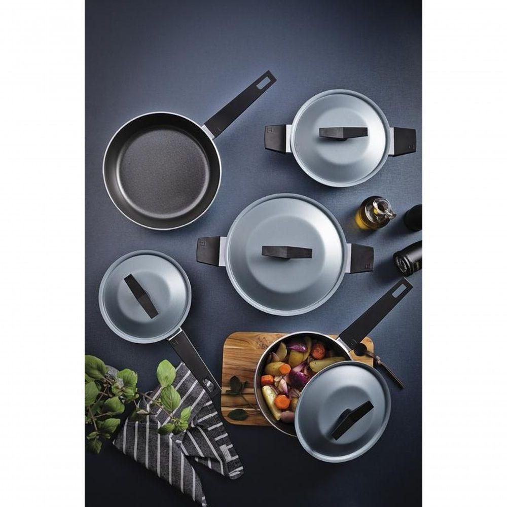 Jogo De Panelas Tramontina Spezia Induction 5 Peças Em Alumínio Com Revestimento Antiaderente Azul Ardósia Cozinhar pode ser leve, rápido e cheio de cor, principalmente quando você tem as panelas certas para acompanhar cada receita. O jogo de panelas Tramontina Spezia Induction na cor azul ardósia mais que beleza para sua cozinha: oferece desempenho, conforto no uso e facilidade na limpeza, tornando o preparo das refeições muito mais simples. Fabricado em alumínio com 3 mm de espessura, o conjunto proporciona um cozimento rápido e por igual, garantindo sabor e textura ideais. O revestimento interno e externo em antiaderente Starflon Excellent evita que os alimentos grudem, economizando tempo e reduzindo o uso de óleo. Além disso, a limpeza se torna muito mais fácil no dia a dia. Composto por cinco peças versáteis, o conjunto acompanha tampas de alumínio e cabos com toque macio (soft-touch), que garantem mais firmeza e no manuseio. com todas as fontes de calor, inclusive fogão por indução, é uma escolha inteligente para quem deseja unir praticidade e um toque de personalidade na cozinha.Ideal para quem busca um jogo de panelas antiaderente, resistente e com diferentes tipos de fogão. Com a qualidade da Tramontina, você tem mais liberdade para criar, experimentar e surpreender.Recomendações de Uso:Modo de Uso: ;A capacidade volumétrica máxima para cozimento é de 3/4 da capacidade total da peça. Posicione o cabo do utensílio voltado ao centro do fogão. Em fogões com grade, centralize a peça sobre a chama ou fonte de calor e alinhe o cabo com a grade. Utensílios quentes devem estar fora do alcance das crianças. Antes do primeiro uso, lave com esponja macia, sabão neutro ou detergente líquido. Depois de secar, unte a área interna com óleo ou gordura e leve ao fogo por um ou dois minutos. Deixe esfriar e lave novamente. Seu utensílio Starflon está pronto para uso com ou sem gordura, sempre em fogo baixo ou médio (nunca superior a 260 ºC). Em fogões de indução, usar somente em potência baixa ou média e evitar a movimentação da peça para prevenir riscos na superfície do fogão. Ao manusear seu utensílio aquecido, cuide para não arranhar/riscar o revestimento externo. Evite manchas, não deixando escorrer gordura e alimentos na área externa da peça. Caso esta situação ocorra, é recomendado realizar a limpeza imediata do com um pano umedecido em água. Para mexer os alimentos use somente utensílios de silicone, nylon ou madeira. Com o uso, a alça, o cabo e o pegador podem afrouxar devido à dilatação normal dos materiais. Reaperte apenas o suficiente, sem forçar. Limpeza: Evite a imersão do utensílio quente em água fria. Nunca utilize produtos abrasivos na lavagem. Se deixar queimar alimentos, umedeça a área e reserve até que possa remover os resíduos grudados com esponja e sabão. Para maior durabilidade não utilize em máquinas de lavar. Para descarte do produto e embalagem siga as orientações de reciclagem vigentes.- Foto meramente ilustrativa.Informações Adicionais:- Pegadores de nylon;- indutivo 15,0 centímetros;- Tampas de alumínio: fácil limpeza e leveza no manuseio- Para maior durabilidade não utilize em máquinas de lavar;- Cabos e alças de baquelite com acabamento soft-touch: oferecem resistência e conforto;- Revestimento interno e externo de antiaderente Starflon Excellent carbono que não gruda, é fácil de limpar, mais durável e não é prejudicial à saúde, pois é livre de PFOA.