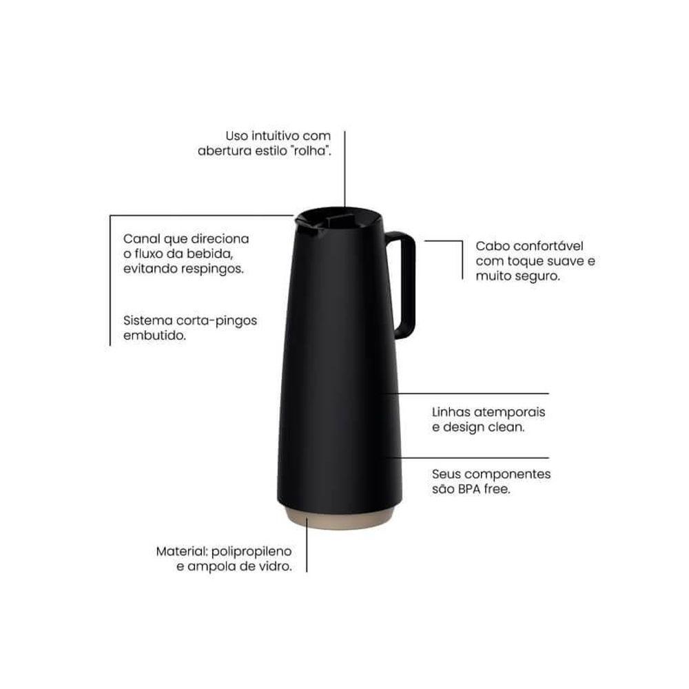 Bule Térmico Tramontina Exata Preto Com Ampola De Vidro 1 LitroPreparar seu café ou chá e garantir a temperatura ideal para eles durante muito mais tempo, o bule térmico Tramontina Exata em polipropileno preto com ampola de vidro 1 litro é indispensável! Seu design é diferenciado e conta com linhas minimalistas e atemporais que oferecem maior estilo a sua mesa e a sua cozinha. Ele é produzido em polipropileno, tem ampola de vidro e pode ser utilizado tanto para líquidos quentes, quanto frios. Sua abertura é em formato rolha com corta-pingos embutido e é de uso , leve e muito confortável. Além de todas essas características, o bule ainda é muito fácil de limpar e vai levar muito mais praticidade a sua cozinha!Recomendações de Uso:Descarte todos os materiais de embalagem e lave o produto;Certifique-se de que o produto esteja bem fechado; não coloque o produto em forno elétrico, micro-ondas, freezer, geladeira e máquina de lavar louças;A capacidade volumétrica poderá ter uma variação de até 10% de seu volume nominal pré-aquecer/pré-refrigerar o produto antes de usar, para manter por mais tempo aquecida/fria a bebida;Para evitar vazamentos, não encha até o topo do produto.CUIDADOS ESPECIAIS:Não agite o produto;Não olhe diretamente para dentro;Não beba diretamente no produto;Não coloque gelo seco, refrigerante, bebidas gaseificadas ou líquidos que possam gerar alta pressão;Não deixe o produto bater ou cair; não coloque bebida quente e em seguida a bebida gelada ou vice-versa, pois isso pode danificar a ampola;Por ser um produto de mesa, recomenda-se que o deste produto seja sempre feito na posição vertical;Mantenha fora do alcance das crianças;Após o uso ou limpeza, aconselhamos deixar o produto aberto;Não remova a ampola de vidro do produto, somente se ela quebrar ou sofrer algum dano e necessitar ser substituída;Todo manuseio de vidro deve ser feito com total atenção, e este produto com ampola de vidro não foge a essa regra;Verifique frequentemente o aperto das peças rosqueáveis (rolha e fundo/base).ORIENTAÇÕES DE LIMPEZA:Lave somente com detergente neutro e esponja macia;Não utilize escova com pontas que possam quebrar a ampola de vidro;Se houver odores desagradáveis, pode-se usar uma solução com a medida de 2 colheres (sopa) de bicarbonato de sódio dissolvidas em água quente (até sua capacidade máxima) e deixar agir por 12 horas; após, fazer a limpeza diária.Informações Adicionais:A capacidade volumétrica poderá ter uma variação de até 10% emseu volume nominal linhas atemporais e design clean, o bule térmico da linha Exata combina com qualquer estilo e para manter líquidos quentes ou frios na temperatura adequada por muito mais intuitivo com abertura estilo que direciona o fluxo da bebida, evitando respingos.Sistema corta-pingos confortável com toque suave e muito .Robusto, simples e moderno, ocupa menos espaço na sua casa e durante o .Praticidade no uso e para toda a famí e fácil de componentes são BPA ênico e de fácil limpeza.Material: polipropileno e ampola de vidro.