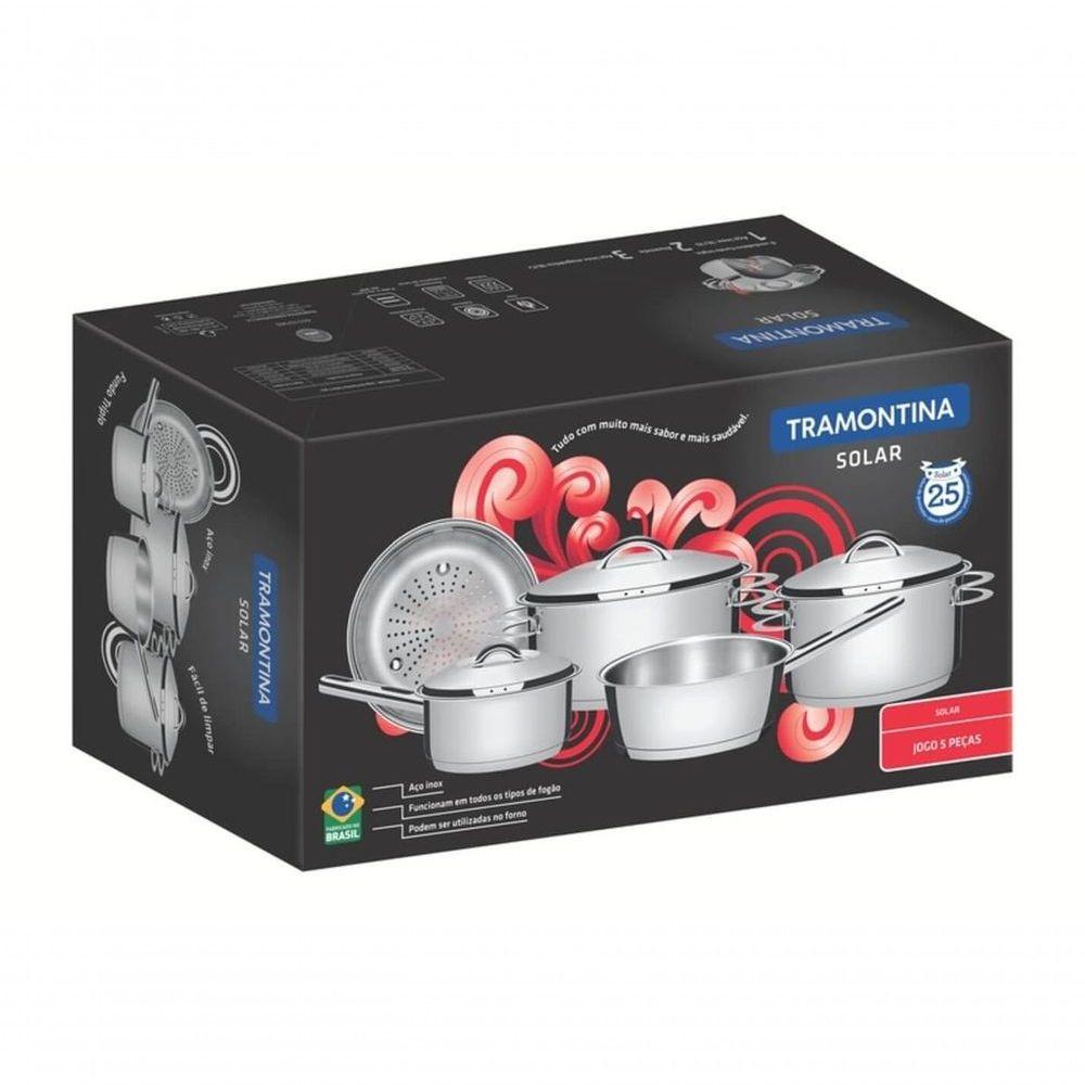 Jogo De Panelas Tramontina Solar Em Aço Inox Com Fundo Triplo 5 Peças Totalmente produzidas em aço inox,o Conjunto de Panelas em Aço Inox com Fundo Triplo e Tampas de Inox 5 Peças Tramontina Solaras, mantém os alimentos saudáveis já que o material não solta resíduos. Trazem ainda a tecnologia de fundo triplo (aço inox + alumínio + aço inox) que distribui o calor uniformemente, proporcionando um cozimento mais rápido e uniforme, economizando energia e deixando os alimentos aquecidos por mais tempo. São peças versáteis que podem ir ao forno para gratinar ou finalizar pratos na temperatura máxima de 260°C e ser utilizadas em diferentes tipos de fogões. Podem ir à máquina de lavar louças diariamente. Garanta uma cozinha completa com esse jogo de panelas clássico da Tramontina!Recomendações de Uso:Antes do uso: Antes de utilizar o , remova as eventuais etiquetas e lave-o com água quente e de uso: Use uma fonte de calor brando para evitar que o alimento grude no fundo da caçarola, não sendo necessário o fogo alto. Quando a caçarola for utilizada no fogão a gás, a chama não deve ultrapassar a base da caç caso de uso de chapa elétrica, a chapa deverá ter diâmetro igual ou inferior ao da caçarola. Sempre dissolva o sal em água fervendo ou com os alimentos, mexendo os ingredientes no início do cozimento. Não aqueça o alimento colocando uma caçarola do mesmo diâmetro sobre a outra. Esse procedimento é perigoso, pois cria vácuo e impossibilita a retirada do mesmo. Alguns alimentos que possuem amido, como massa e arroz, poderão deixar manchas na parte interna da caçarola durante o cozimento. Para remover facilmente as manchas, passe um pano umedecido com suco de limão ou vinagre, ou utilize a pasta para polir e remover manchas Tramontina (94537000). Depois da lavagem, sempre que possível, enxágue a caçarola com água quente e seque-a imediatamente, pois o cloro e as substâncias contidas na água podem deixar manchas na caçarola. Não deixe a caçarola vazia sobre uma fonte de calor. Deixe as caçarolas quentes somente em superfícies resistentes ao calor. Os cabos de inox aquecem durante o cozimento, por isso use luvas durante o ácil de limpar: deixar sua panela brilhando é simples, você só precisa de água, sabão e uma esponja macia. Se preferir, é só colocar na máquina de lavar.Informações Adicionais:- Tampas com saída de de vapor;- Totalmente produzida em aço inox, por isso não solta nenhum resíduo nos alimentos;- Capacidade volumétrica máxima para cozimento é de 3/4 da capacidade total de cada peça;- O fundo triplo (aço inox + alumínio + aço inox) distribui o calor uniformemente, proporcionando um cozimento mais rápido e uniforme.- Foto meramente ilustrativa.