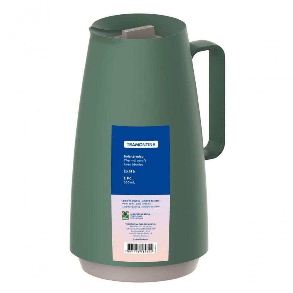 Bule Térmico Tramontina Exata Verde Com Ampola De Vidro 500mlIdeal para colocar suas bebidas preferidas, ;o bule térmico Tramontina Exata em plástico verde com ampola de vidro 500 ml deixará seus momentos ainda melhor, pois mantém a temperatura ideal por muito mais tempo, já que conta com ampola especial de vidro. Sua utilização é primorosa, pois ele conta com para um perfeito direcionamento da bebida. O bule é leve, ocupa menor espaço em sua cozinha. Leve praticidade e beleza para seu dia!Recomendações de Uso:Modo de Uso: Descarte todos os materiais de embalagem e lave o produto; Certifique-se de que o produto esteja bem fechado; não coloque o produto em forno elétrico, micro-ondas, freezer, geladeira e máquina de lavar louças; A capacidade volumétrica poderá ter uma variação de até 10% de seu volume nominal indicado. Recomendamos pré-aquecer/pré-refrigerar o produto antes de usar, para manter por mais tempo aquecida/fria a bebida; Para evitar vazamentos, não encha até o topo do produto. Não agite o produto; Não olhe diretamente para dentro; Não beba diretamente no produto; Não coloque gelo seco, refrigerante, bebidas gaseificadas ou líquidos que possam gerar alta pressão; Não deixe o produto bater ou cair; não coloque bebida quente e em seguida a bebida gelada ou vice-versa, pois isso pode danificar a ampola; Por ser um produto de mesa, recomenda-se em manter o produto sempre na posição vertical; Mantenha fora do alcance das crianças; Após o uso ou limpeza, aconselhamos deixar o produto aberto; Não remova a ampola de vidro do produto, somente se ela quebrar ou sofrer algum dano e necessitar ser substituída; Todo manuseio de vidro deve ser feito com total atenção, e este produto com ampola de vidro não foge a essa regra; Verifique frequentemente o aperto das peças rosqueáveis (rolha e fundo/base). Lave somente com detergente neutro e esponja macia; Não utilize escova com pontas que possam quebrar a ampola de vidro; Se houver odores desagradáveis, pode-se usar uma solução com a medida de 2 colheres (sopa) de bicarbonato de sódio dissolvidas em água quente (até sua capacidade máxima) e deixar agir por 12 horas; após, fazer a limpeza diária.- Foto meramente ilustrativa.Informações Adicionais:- Leve e fácil de manusear;- Higiênico e de fácil limpeza;- Sistema corta-pingos embutido;- Seus componentes são BPA free;- Uso intuitivo com abertura estilo "rolha";- Cabo confortável com toque suave e muito ;- que direciona o fluxo da bebida, evitando respingos;- Ideal para manter líquidos quentes ou frios na temperatura adequada por muito mais tempo;- A capacidade volumétrica poderá ter uma variação de até 10% em seu volume nominal indicado.