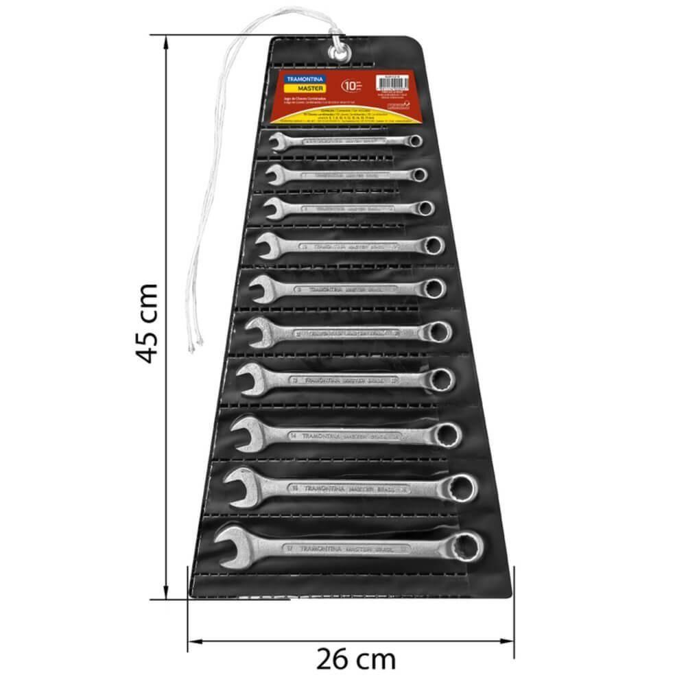 Jogo De Chaves Combinadas Tramontina Master Com Corpo Forjado Em Aço Vanádio Cromado 10 Peças Realizar consertos fica muito mais fácil quando se tem as ferramentas certas em mãos. O Jogo de Chaves Combinadas Tramontina MASTER com 10 peças em milímetros garante versatilidade e praticidade para apertar e afrouxar porcas e parafusos de diferentes tamanhos. Produzidas em aço vanádio forjado com acabamento cromado, as chaves oferecem alta resistência, durabilidade e desempenho superior. Um conjunto indispensável para a sua oficina ou caixa de ferramentas.Recomendações de Uso:Modo de uso: Use óculos, luvas e outros equipamentos de proteção de acordo com a tarefa a ser executada. Não golpeie as chaves, a não ser que sejam projetadas para este fim. Sempre utilize uma chave de bitola correta para cada parafuso ou porca para que não haja folga, pois isso danifica a chave e o parafuso. Mantenha a chave limpa para um melhor agarre, pois usá-la suja com graxa ou óleo pode causar acidentes. Não use tubos ou extensões para obter mais torque. Não altere a forma das chaves. Armazene em limpo e seco.- Foto meramente ilustrativa.Informações Adicionais:- Pescoço longo;- ;Acabamento cromado;- Abertura das bocas calibradas;- Corpo forjado em aço vanádio e temperado;- O teste de dureza é realizado em vários pontos para assegurar a resistência ao desgaste da chave ; durante o uso ininterrupto;- Alguns tipos de chaves de aperto são fornecidos em bitolas métricas e em polegadas, para o uso nos diversos fixadores disponíveis;- As aberturas das bocas das chaves de aperto são verificadas com gabaritos calibrados, o que garante seu perfeito acoplamento nos parafusos.