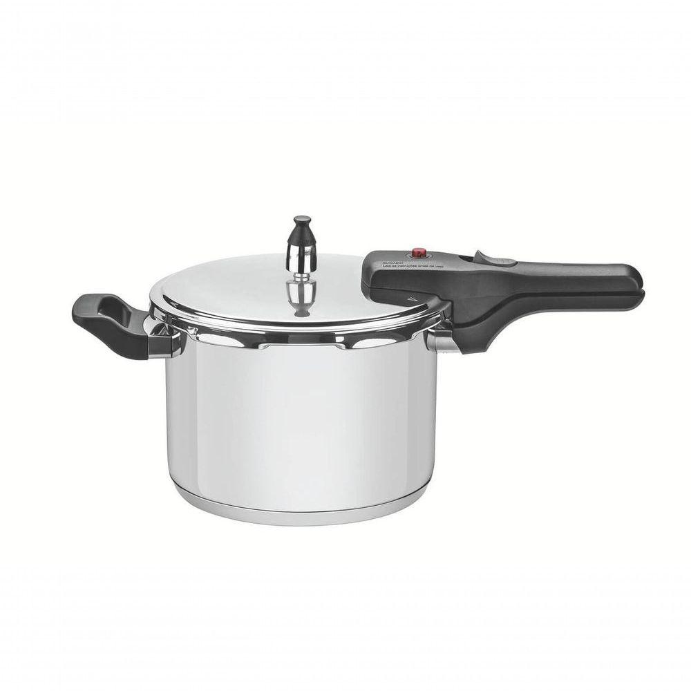 Panela De Pressão Tramontina Brava Aço Inox 22 Cm 6 LitrosGaranta muito mais praticidade e versatilidade na hora de cozinhar com a Panela de Pressão Brava em Aço Inox com Fundo Triplo 22 cm 6 Litros Tramontina, pois ela é produzida em aço inox com fundo triplo. Além do sistema de descompressão e cinco dispositivos de ela conta com cabo e alça antitérmicos. Com ela você irá deixar sua rotina na cozinha muito mais fácil!Recomendações de Uso:Antes do Uso: Para manter sua panela de pressão bonita, recomenda-se lavar somente com detergente neutro e esponja macia. O cloro e as substâncias contidas na água podem deixar manchas no aço inox.Modo de Uso: Evite deixar alimentos na panela por muito tempo. O sal também poderá provocar manchas e até corrosão. Se surgirem manchas brancas devido ao excesso de cloro na água ou amido dos alimentos, limpe-as com um pouco de vinagre ou suco de limão. Chamas muito fortes podem causar alteração na cor do aço inox, provocando manchas douradas ou azuladas. Recomenda-se utilizar fogo baixo. Nunca remova os parafusos de sua panela de pressão. Os componentes só devem ser manuseados pela Tramontina ou sua rede de Assistência Técnica Autorizada. Para uma maior vida útil do anel de vedação da tampa, unte-o periodicamente com óleo de cozinha. Substitua este anel de vedação a cada 2 anos para um bom desempenho do produto, ou sempre que estiver . A válvula de trabalho deve ser substituída a cada 5 anos para um bom desempenho do produto, ou sempre que estiver danificada.- Foto meramente ilustrativa.Informações Adicionais:- Alça e cabo antitérmico;- Totalmente feita de aço inox;- Possui sistema de descompressão;- Possui 80 kPa de pressão de trabalho;- Anel de vedação para reposição: 62416/990;- Possui medidor de capacidade internamente;- Válvula de trabalho para reposição: 62416/921.- O fundo triplo (aço inox + alumínio + aço inox);- Capacidade mínima: 250 ml de líquido (1/4 litro);- É atestada pela Norma de ;- Não pode ser utilizada em máquina de lavar louças;- Capacidade máxima: 2/3 da sua capacidade (alimento + líquido).