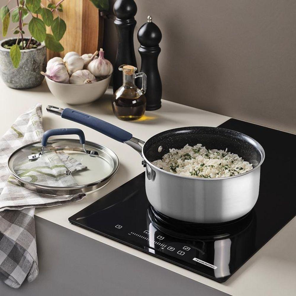Panela Tramontina Romagna Aço Inox E Alumínio 18cm Com Revestimento Cerâmico Black StoneA panela Tramontina Romagna com revestimento cerâmico Black Stone de 18 centímetros e 2,25 litros é ideal para o preparo de receitas diárias com praticidade e eficiência. Perfeita para porções médias, como arroz, carnes ou sopas, ela se destaca pela combinação entre alumínio e aço inox, garantindo aquecimento rápido e uniforme com a tecnologia Biply Induction. com todos os tipos de fogões, incluindo indução, oferece versatilidade no uso. Seu revestimento interno cerâmico facilita a limpeza e evita que os alimentos grudem. As alças metálicas com proteção de silicone asseguram conforto térmico e durante o manuseio. Com acabamento na cor Black Stone, ela adiciona modernidade à sua cozinha sem abrir mão da praticidade no preparo.Recomendações de Uso:Modo de uso: O uso prolongado em temperaturas altas pode causar o amarelamento da superfície em aço inox. Para que a panela de aço inox fique sempre bonita e com brilho, recomendamos que seja lavada somente com detergente neutro e esponja. Nas partes foscas da panela pode-se utilizar o lado mais abrasivo da esponja com saponáceo líquido, para remover as manchas mais difíceis, ou ainda, pode ser usada a pasta para polimento e remoção de manchas da Tramontina. Depois da lavagem, enxágue a panela com água quente e seque-a imediatamente, para que ela mantenha o brilho , pois o cloro e as substâncias contidas na água podem deixar manchas na panela.- Foto meramente ilustrativa.Informações Adicionais:- Corpo de aço inox + alumínio;- Revestimento interno cerâmico;- Com espessura de 2,7 mm de alumínio e 0,6 mm de aço inox;- Tecnologia Biply: Dupla camada: durabilidade do aço inox + eficiência do alumínio;- Seu utensílio resiste à máquina de lavar louças, embora diferentes detergentes para uso nestas máquinas podem ser mais agressivos e acelerar o desgaste de seu utensílio e reduzir as propriedades de antiaderência.