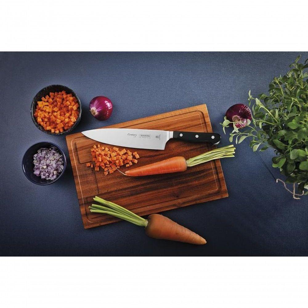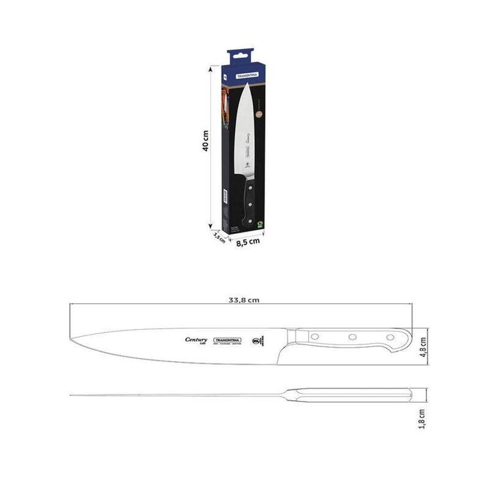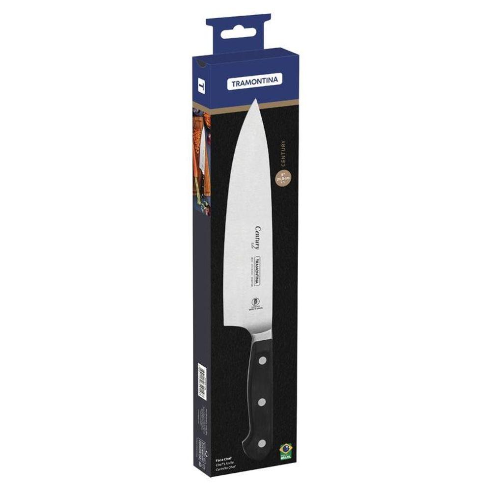 Faca Chef Tramontina Century Em Aço Inox E Cabo Em Policarbonato 8"A faca chef Tramontina Century com lâmina em aço inox e cabo em policarbonato com fibra de vidro 8 polegadas foi desenvolvida para quem busca cortes precisos e desempenho . Sua lâmina forjada em aço inox oferece resistência e precisão mesmo nos preparos mais exigentes, enquanto o cabo ergonômico garante firmeza e conforto no uso contínuo. A meia guarnição deixa a faca mais leve e permite o uso de toda a lâmina no corte e na hora de afiar. Resistente à lava-louças, é uma aliada prática e robusta para quem valoriza técnica, agilidade e confiança na cozinha.Recomendações de Uso:Modo de uso: ;Antes da primeira utilização, lave bem a peça e seque-a. Produto cortante e perfurante: tenha cuidado ao manusear e mantenha fora do alcance das crianças. Para maior durabilidade do produto recomenda-se secar bem antes de guardar, mesmo após lavagem em máquina. Recomenda-se o uso de tábuas de polipropileno ou madeira da Tramontina para maior durabilidade do fio da faca. Não é indicado o uso da faca para o corte de alimentos congelados. Mantenha sempre sua faca afiada utilizando os afiadores da Tramontina. Para descarte dos produtos e embalagens siga as orientações de reciclagem vigentes.- Foto meramente ilustrativa.Informações Adicionais:- Pode ir à máquina de lavar louças facilitando seu dia a dia;- A lâmina forjada de aço inox especial garante um fio com maior durabilidade e precisão;- O cabo ergonômico proporciona maior , equilíbrio e conforto na hora do corte;- A lâmina possui tratamento térmico diferenciado, composto por têmpera, sub- e revenimento;- O cabo de policarbonato reforçado com fibra de vidro garante alta durabilidade, equilíbrio e ;- E conta com dureza da lâmina de 55 e 58 HRC, que garante maior resistência do fio e precisão no corte.