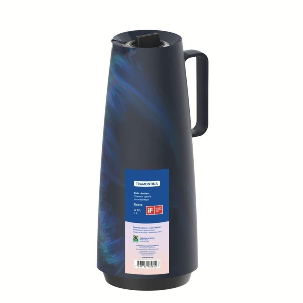 Bule Térmico Tramontina Exata Marmorizado Azul 1 LitroCom design diferenciado e em um tom de azul marmorizado, bule térmico Tramontina Exata em polipropileno marmorizado azul 1 litro é a opção perfeita para os amantes de café que desejam desfrutar de uma bebida quente ao longo do dia. Fabricado em polipropileno, é um bule versátil, e pode ser utilizado tanto para líquidos quentes quanto frios. Sua abertura é em formato de rolha com corta-pingos embutido que garante praticidade e no uso, tornando-o leve e extremamente confortável. Dê um toque de elegância à sua mesa e torne seu dia a dia muito mais gostoso!Recomendações de Uso:Modo de Uso: Descarte todos os materiais de embalagem e lave o produto; Certifique-se de que o produto esteja bem fechado; não coloque o produto em forno elétrico, micro-ondas, freezer, geladeira e máquina de lavar louças; A capacidade volumétrica poderá ter uma variação de até 10% de seu volume nominal indicado. DICAS: Recomendamos pré-aquecer/pré-refrigerar o produto antes de usar, para manter por mais tempo aquecida/fria a bebida; Para evitar vazamentos, não encha até o topo do produto. Não agite o produto; Não olhe diretamente para dentro; Não beba diretamente no produto; Não coloque gelo seco, refrigerante, bebidas gaseificadas ou líquidos que possam gerar alta pressão; Não deixe o produto bater ou cair; não coloque bebida quente e em seguida a bebida gelada ou vice-versa, pois isso pode danificar a ampola; Por ser um produto de mesa, recomenda-se em manter o produto sempre na posição vertical; Mantenha fora do alcance das crianças; Após o uso ou limpeza, aconselhamos deixar o produto aberto; Não remova a ampola de vidro do produto, somente se ela quebrar ou sofrer algum dano e necessitar ser substituída; Todo manuseio de vidro deve ser feito com total atenção, e este produto com ampola de vidro não foge a essa regra; Verifique frequentemente o aperto das peças rosqueáveis (rolha e fundo/base). Lave somente com detergente neutro e esponja macia; Não utilize escova com pontas que possam quebrar a ampola de vidro; Se houver odores desagradáveis, pode-se usar uma solução com a medida de 2 colheres (sopa) de bicarbonato de sódio dissolvidas em água quente (até sua capacidade máxima) e deixar agir por 12 horas; após, fazer a limpeza diária.- Foto meramente ilustrativa.Informações Adicionais:- Leve e fácil de manusear;- Higiênico e de fácil limpeza;- Sistema corta-pingos embutido;- Seus componentes são BPA free;- Uso intuitivo com abertura estilo "rolha";- Ampola de vidro para reposição: 61636/930;- Cabo confortável com toque suave e muito ;- que direciona o fluxo da bebida, evitando respingos;- Ideal para manter líquidos quentes ou frios na temperatura adequada por muito mais tempo;- A capacidade volumétrica poderá ter uma variação de até 10% em seu volume nominal indicado.