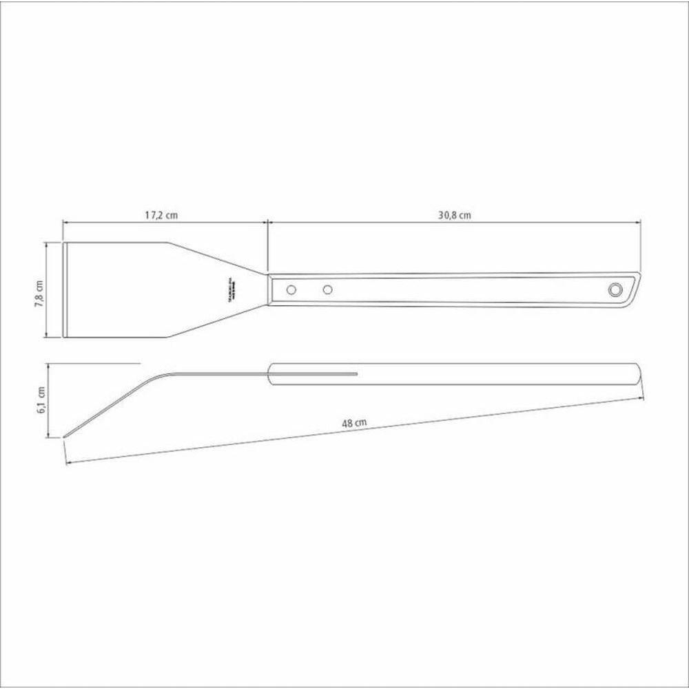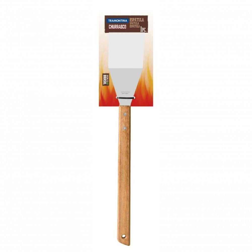 Espátula Tramontina Churrasco Com Lâmina Em Aço Inox E Cabo De Madeira 48cmUma linha que mostra a tradição sem perder a qualidade e a durabilidadede seus produtos, possuem cabos em madeira e lâminas em aço inox.Recomendações de Uso:- Antes do uso: Antes de utilizar o , remova as eventuais etiquetas e lave-o com água quente e detergente.- Modo de uso: Durante a lavagem use somente esponja macia, outros tipos de produtos, como palha de aço, poderão riscar ou prejudicar o brilho do utensílio. Enxágue bem a peça a fim de remover totalmente os resíduos dos produtos de limpeza. Após a lavagem enxugue o utensílio pois as substâncias químicas contidas na água poderão causar manchas. Sempre que possível use água quente, pois renova o brilho do utensílio. Evite o da peça com superfícies quentes, pois poderá provocar a descoloração do produto. Quando usar a máquina de lavar louça, recomendamos retirar o utensílio logo que tenha terminado o ciclo enxaguar, a fim de que os mesmos sejam secados manualmente.- uso e adequado: Tenha cuidado ao Manusear produtos cortantes e perfurantes e mantenha-os fora do alcance de crianças.- Foto meramente ilustrativa.Informações Adicionais:- Lâmina em aço inox.- Cabo de madeira fixado por rebites de alumínio.- Cabo rústico e natural.- A espessura do aço e a estampagem da lâmina, garantem maior resistência do produto, evitando deformações.- Permanece bonito por muito mais tempo.