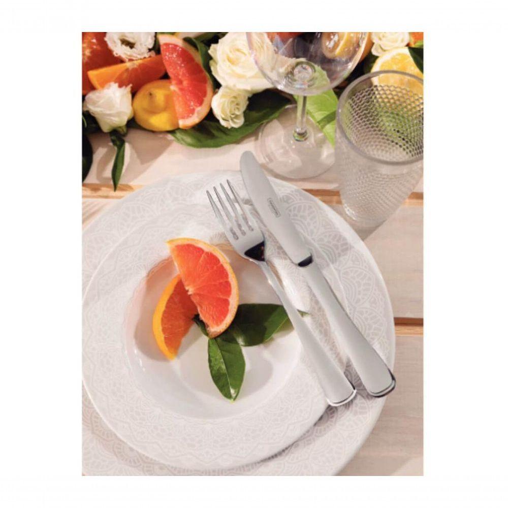 Garfo De Mesa Tramontina Mônaco Em Aço Inox O Garfo de Mesa Tramontina Mônaco em Aço Inox Acabamento Alto Brilho com Detalhes no Cabo é perfeito para você ter na cozinha. Ideal para diferentes momentos e receitas, ele traz mais praticidade e beleza na hora de servir. Totalmente produzido em aço inox, ele apresenta um moderno acabamento em alto brilho e detalhes em alto relevo no cabo. Altamente durável e cheio de estilo, possui dentes polidos na parte interna que proporcionam mais conforto no uso, além de formato apropriado para a boca e bordas arredondadas. É ainda muito fácil de limpar, podendo ser lavado diariamente na máquina de lavar louças.Recomendações de Uso:Antes do uso: Antes de utilizar o , remova as eventuais etiquetas e lave-o com água quente e de uso:Durante a lavagem use somente esponja macia, outros tipos de produtos, como palha de aço, poderão riscar ou prejudicar o brilho dos talheres. Enxágue bem cada peça a fim de remover totalmente os resíduos dos produtos de limpeza, que por serem abrasivos, podem danificar o inox. Após a lavagem enxugue os talheres, pois as substâncias químicas contidas na água poderão causar manchas. Sempre que possível use água quente, pois renova o brilho dos talheres. Evite o das peças com superfícies quentes, pois podem provocar a descoloração do produto. Quando usar a máquina de lavar louça, recomendamos retirar os talheres logo que tenha terminado o ciclo enxaguar, a fim de que os mesmos sejam secados manualmente.- Foto meramente ilustrativa.Informações Adicionais:- Acabamento em brilho;- Pode ser lavada, diariamente, à maquina de lavar louças;- Peças com detalhes no cabo, combinando com qualquer ambiente;- Em aço inoxidável, altamente duráveis, mantém as características , preservando a beleza, a higiene e a durabilidade do material.