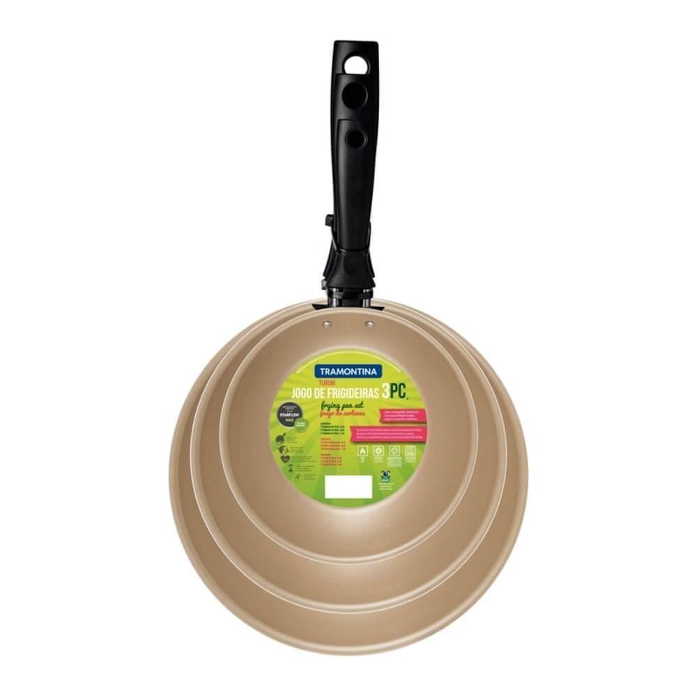 Jogo De Frigideiras Tramontina Turim Alumínio Vermelho 3 PeçasA Linha Turim chegou para completarsua cozinha. Com design e elegância, a eficiência do antiaderente aliada adiferentes composições de cores. O Jogo de Frigideiras Alumínio Turim é idealpara quem gosta de manter a tradição na cozinha.Recomendações de Uso:Antes do uso: remova eventuais etiquetas, lave interna e externamente o utensílio, usando apenas uma esponja macia, sabão neutro ou detergente líquido. Outros tipos de produtos, como palha de aço, poderão riscar ou prejudicar a peça. Depois de secar, unte a área interna com óleo ou gordura, e leve ao fogo em temperatura baixa por um ou dois minutos. Deixe esfriar, lave e enxugue novamente. A partir daí poderá ser com ou sem de uso: evite esquentar o utensílio vazio. Use sempre aquecimento baixo ou médio para reter o valor nutritivo dos alimentos e conservar o revestimento do utensílio (nunca superior a 350°). Evite que as chamas atinjam as laterais do utensílio. Para mexer ou retirar o alimento, utilize somente utensílios de madeira, nylon ou silicone, que não danificam a superfície com antiaderente. Nunca corte alimentos diretamente no revestimento antiaderente. Ao manusear seu utensílio aquecido, cuide para não arranhar/riscar o revestimento externo. Evite escorrer gordura nas partes externas da peça, pois em com o fogo pode causar ós o uso: deixe o utensílio esfriar antes de lavar. Evite imersão do utensílio quente em água fria. Se deixar queimar alimentos, umedeça a área e reserve até que possa remover os resíduos grudados com esponja e sabão. Mesmo depois de vários usos, nunca utilize produtos abrasivos na lavagem.- Foto meramente ilustrativa.Informações Adicionais:- Frigideiras em alumínio com revestimento interno e externo de antiaderente Starflon T1.- Devido ao revestimento antiaderente os alimentos não grudam, proporcionando facilidade na limpeza.- Proporciona um cozimento rápido e uniforme.- Cabos com furo passante para pendurar o produto.- Cabos de baquelite antitérmico.- Podem ser utilizadas em fogão a gás, elétrico e vitrocerâmico (resistência elétrica).- Podem ser levadas à máquina de lavar louça.