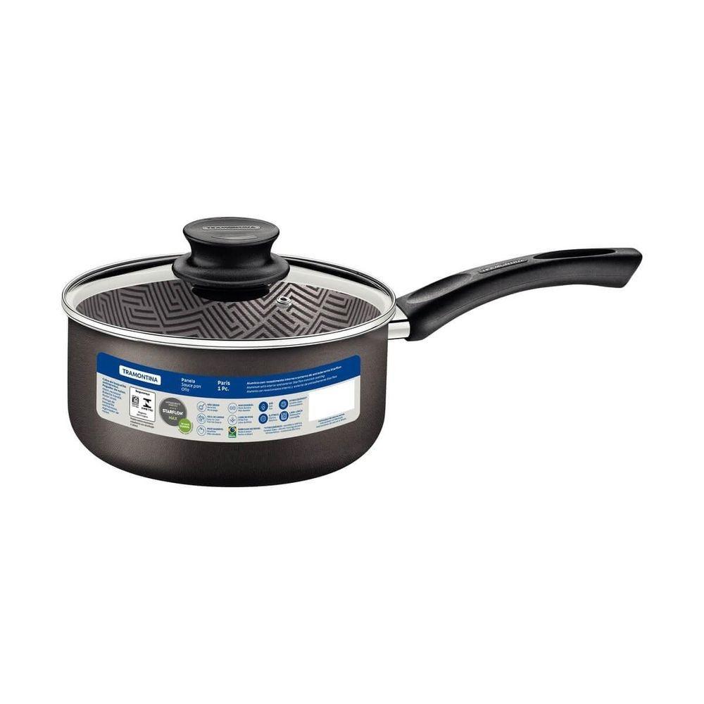 Panela Tramontina Paris 18cm Em Alumínio Com Revestimento Antiaderente Chumbo E Tampa De VidroLeve qualidade, praticidade e versatilidade para sua cozinha, com a panela Tramontina Paris em alumínio com revestimento interno e externo em antiaderente Starflon Max chumbo com tampa de vidro 18 centímetros 2,1 litros. Perfeita para uso diário, ela é produzida em alumínio com espessura de 1,8 milímetros e possui revestimento interno e externo em antiaderente Starflon Max. Devido a esses atributos, ela garante o cozimento rápido e uniforme dos alimentos. evita que eles grudem em sua superfície, é mais durável e não é prejudicial a sua saúde. Ela vem com tampa de vidro temperado com saída de vapor e borda de aço inox. E conta com cabo de baquelite antitérmico, material que não aquece e oferece maior durante o manuseio. Ela ainda é muito fácil de limpar e pode ir à máquina de lavar louças, otimizando seu dia a dia na cozinha!Recomendações de Uso:Antes do Uso: Lave com esponja macia, sabão neutro ou detergente líquido. Depois de secar, unte a área interna com óleo ou gordura e leve ao fogo por um ou dois minutos. Deixe esfriar e lave novamente. Seu utensílio Starflon está pronto para uso com ou sem gordura, sempre em fogo baixo ou médio (nunca superior a 260 °C). Para mexer os alimentos use somente utensílios de silicone, nylon ou madeira. Com o uso, o cabo e o pegador podem afrouxar devido à dilatação normal dos materiais. Reaperte apenas o suficiente, sem forçar. Limpeza: Evite a imersão do utensílio quente em água fria. Nunca utilize produtos abrasivos na lavagem. Se deixar queimar alimentos, umedeça a área e reserve até que possa remover os resíduos grudados com esponja e sabão. Para descarte do produto e embalagem siga as orientações de reciclagem vigentes.- Foto meramente ilustrativa.Informações Adicionais:- Pode ir à máquina de lavar louças facilitando seu dia a dia;- Tampa de vidro temperado, com saída de vapor e borda de aço inox;- Revestimento interno e externo de antiaderente Starflon Max livre de PFOA;- A capacidade volumétrica máxima para cozimento é de 3/4 da capacidade total da peça;- Cabo de baquelite antitérmico e pegador de nylon que oferecem durante o manuseio.