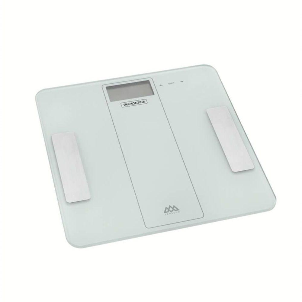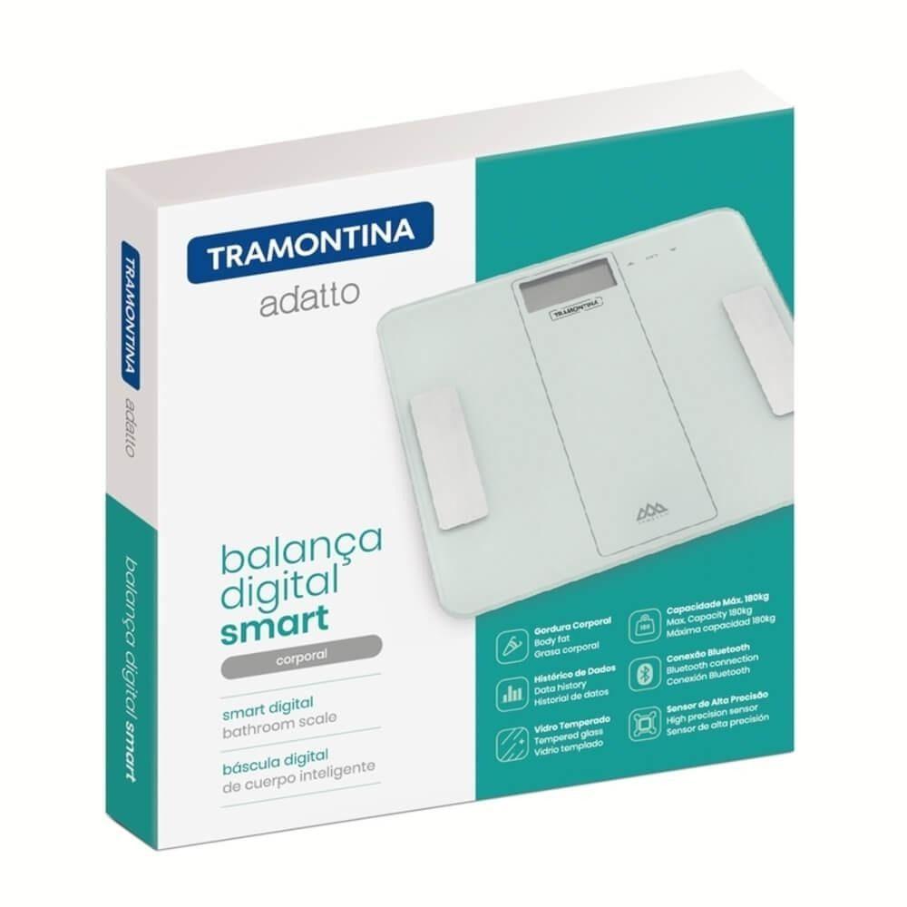 Balança Digital Smart Tramontina Adatto CorporalSe você busca um item de alta tecnologia e que vai garantir um controle perfeito do seu peso, a balança digital smart Tramontina Adatto corporal é indispensável. Produzida com plataforma de vidro temperado, ela efetua a pesagem de carga de até 180 quilos, controla seu peso e mantém seu histórico de dados, tudo isso, por meio de aplicativo e conexão bluetooth. Seu sensor possui alta precisão e funciona com duas pilhas AAA. Mais um item Tramontina, pensado para facilitar sua vida e deixá-la muito mais prática!Recomendações de Uso:Para garantir uma melhor precisão do resultado, coloque a balança em um piso duro e plano. Evite carpetes ou superfícies macias, pois podem afetar o resultado da ão use a balança em ambiente úmido e superaquecido. (Faixa de temperatura ideal entre 5°C e 35° plataforma ficará escorregadia quando molhada. Mantenha-a de pé na balança com firmeza e toque os eletrodos da plataforma com os pés descalços. Cuidado, você poderá tombar/cair quando pisar somente um lado da borda da balanção deixe cair, não provoque choques ou bata na balança, pois se trata de um instrumento de precisã a balança com um pano úmido e evite que a água entre na balança. NÃO use agentes de limpeza químicos /abrasivos/ácidos.Mantenha-se firme na balança quando em garantir uma melhor precisão e interpretação dos dados obtidos no aplicativo ao longo do tempo, recomenda-se que as medições sejam realizadas no mesmo horário do as pilhas acabarem, remova-as a tempo de prevenir que o vazamento resultante da corrosão dos elementos (de chumbo) escorra para o corpo da balança.Verifique periodicamente as condições das pilhas, pois pilhas com vazamento podem danificar o produto. Remova as pilhas sempre que a balança for ficar sem uso por longos períodos de ÃO use para fins comerciais: este produto foi projetado para uso doméstico e apenas para a finalidade descrita neste manual.Mulheres grávidas, aquelas com sintoma de edema e em tratamento de diálise não são aconselhadas a usar o dispositivo. Aqueles que usam marcapasso cardíaco ou outro dispositivo médico implantado são proibidos de usar o dispositivo.Informações Adicionais:Plataforma de vidro temperado.Gordura órico de ão e configure o de alta precisão.Capacidade máxima: 180 kg2 pilhas AAA de 1,5 V (não acompanham o produto).
