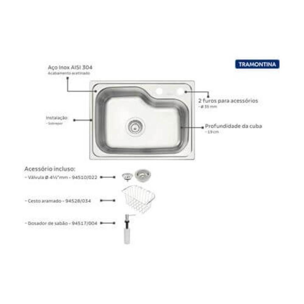 Cuba Compacta Tramontina Morgana 48 Fx Em Aço Inox Com Acessórios A cuba Morgana Compact 48 FX oferece funcionalidade, resistência e beleza sem igual. Fabricada em Aço Inox acetinado de 0,8 mm de espessura, acompanha Válvula, Dosador de Sabão e Cesta Aramada. Irá proporcionar para sua cozinha uma beleza única. Desenvolvida para ambientes compactos, traz um toque de sofisticação e garante mais praticidade no dia a dia. A cuba irá suprir muito bem as demandas diárias, em razão da profundidade de 19 cm e da praticidade dos acessórios. A escolha certa para tornar o seu projeto ainda mais incrível!Recomendações de Uso:Antes do Uso: Remover a etiqueta colada na cuba. Limpar a pia com detergentes normais neutros.Modo de Uso: ;Usar somente esponja macia ou pano para lavar. Esta peça contém bordas cortantes. Manusear com cuidado. Não usar ácido muriático, água sanitária ou qualquer outro solvente para lavar objetos. Na reforma ou construção, proteger a pia para não deixar sobre a mesma pó de cimento ou gesso. Enxaguar e secar bem a peça após o uso. Nunca deixar objetos metálicos sobre a peça por períodos muito longos, para evitar a corrosão. Para manter o brilho, recomenda-se o uso da pasta para polir e remover manchas em superfícies de aço inoxidável "Tramontina".Informações Adicionais:- Cuba: Simples;- Capacidade: 25 L;- Instalação: Sobrepor;- Furo para torneira: Sim;- Material: Aço Inox AISI 304;- Profundidade da cuba: 19 cm;- Manta adesiva anti-ruído: sim;Acessórios inclusos:- Kit de instalação- 1 Válvula 4 1/2- Cesto aramado- Dosador de SabãoNicho para instalação: 525 X 395 mm.- Foto meramente ilustrativa. ;