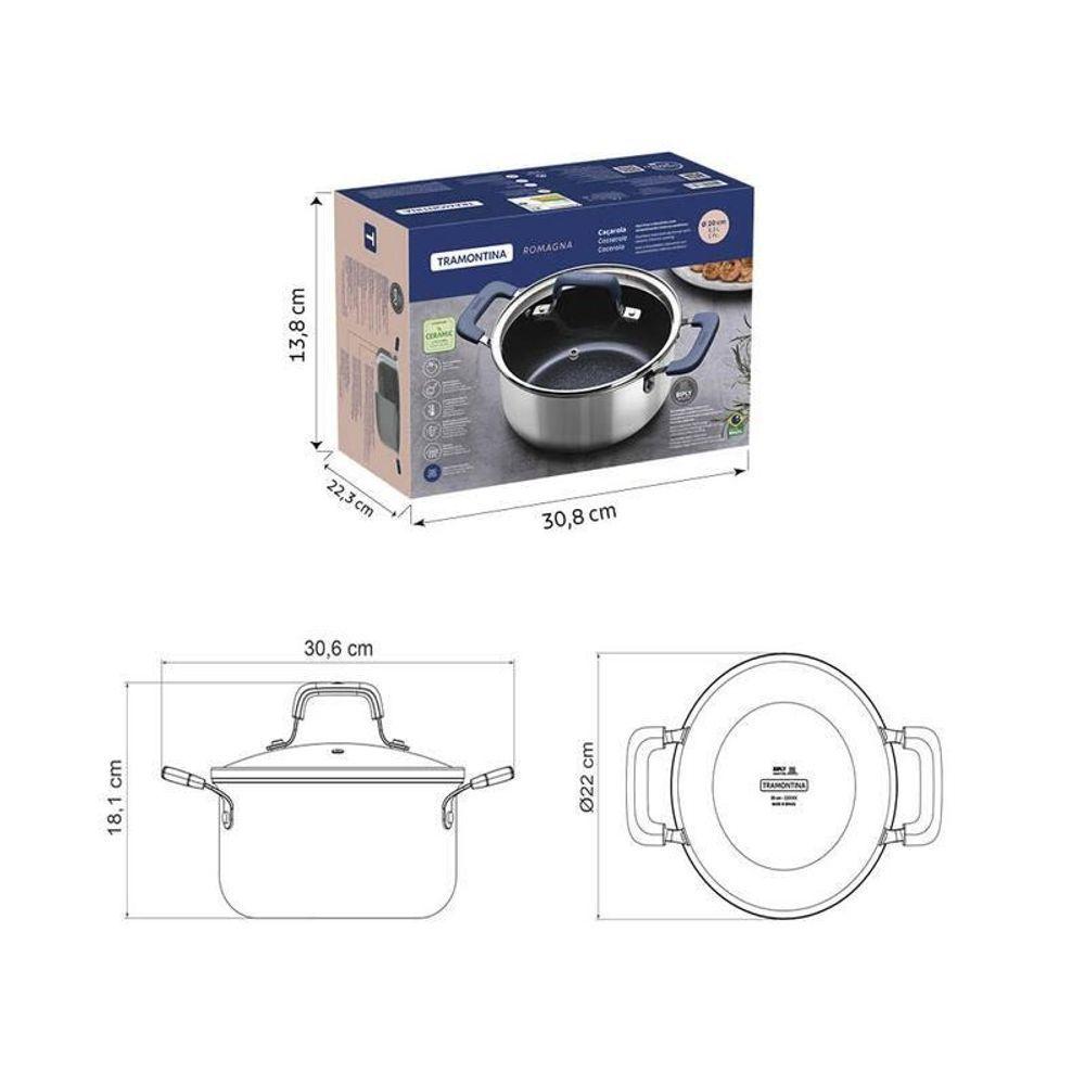 Caçarola Tramontina Romagna Aço Inox E Alumínio 20cm Com Revestimento Cerâmico Black StonePara otimizar o preparo das suas receitas do dia a dia, a caçarola Tramontina Romagna de 20 centímetros e 3,2 litros com revestimento interno cerâmico Black Stone é a aliada certa. Indicada para porções médias, ela garante aquecimento uniforme graças à tecnologia Biply Induction, que combina aço inox e alumínio para distribuir o calor com eficiência. O revestimento cerâmico facilita a limpeza e contribui para um cozimento mais saudável, preservando o sabor dos alimentos. As alças metálicas com proteção de silicone proporcionam conforto no manuseio, e a tampa de vidro temperado permite acompanhar a preparação sem abrir. Uma caçarola versátil, com todos os tipos de fogões, que combina desempenho e visual moderno para a sua cozinha.Recomendações de Uso:Modo de uso: O uso prolongado em temperaturas altas pode causar o amarelamento da superfície em aço inox. Para que a panela de aço inox fique sempre bonita e com brilho, recomendamos que seja lavada somente com detergente neutro e esponja. Nas partes foscas da panela pode-se utilizar o lado mais abrasivo da esponja com saponáceo líquido, para remover as manchas mais difíceis, ou ainda, pode ser usada a pasta para polimento e remoção de manchas da Tramontina. Depois da lavagem, enxágue a panela com água quente e seque-a imediatamente, para que ela mantenha o brilho , pois o cloro e as substâncias contidas na água podem deixar manchas na panela.- Foto meramente ilustrativa.Informações Adicionais:- Corpo de aço inox + alumínio;- Revestimento interno cerâmico;- Com espessura de 2,7 mm de alumínio e 0,6 mm de aço inox;- Tecnologia Biply: Dupla camada: durabilidade do aço inox + eficiência do alumínio;- Seu utensílio resiste à máquina de lavar louças, embora diferentes detergentes para uso nestas máquinas podem ser mais agressivos e acelerar o desgaste de seu utensílio e reduzir as propriedades de antiaderência.