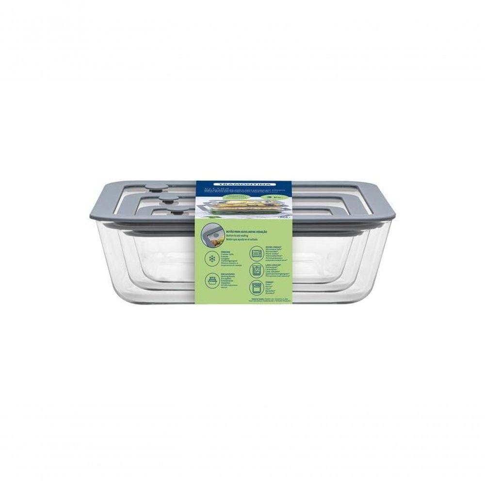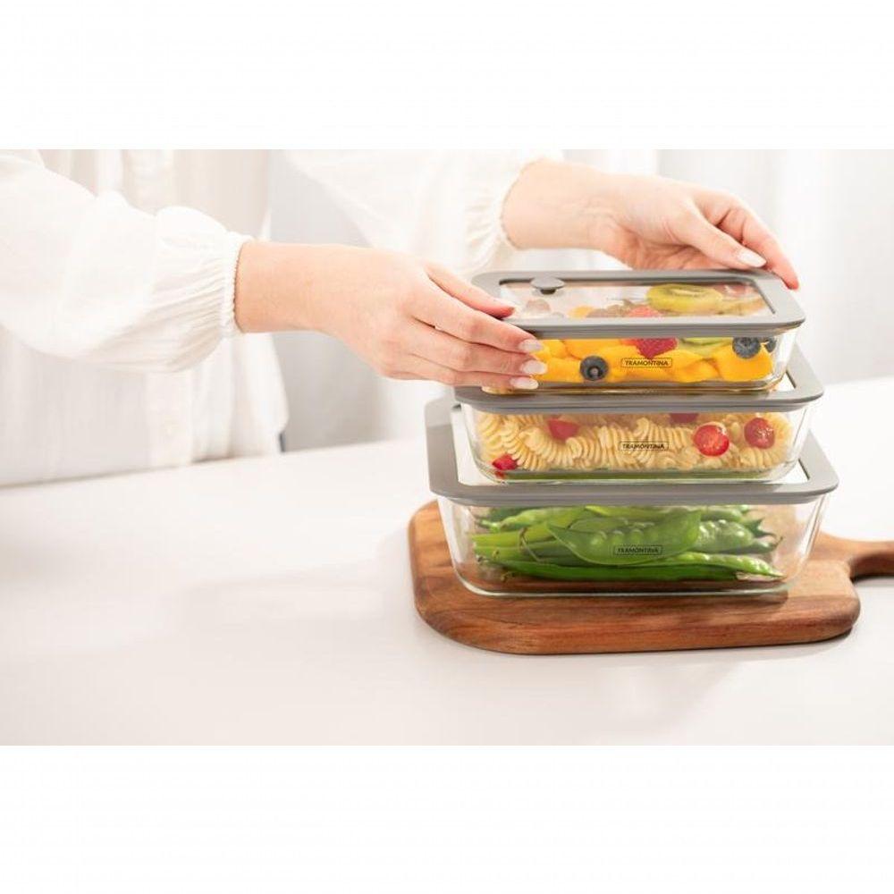 Jogo De Potes De Vidro Tramontina Vittra Com Tampa Hermética De SiliconeOrganização e cuidado com os alimentos começam pelos detalhes certos. O conjunto de potes de vidro Tramontina Vittra retangulares com tampa de silicone hermética oferece a solução perfeita para conservar alimentos com mais e eficiência. Composto por três tamanhos diferentes, ele permite armazenar porções , mantendo tudo sempre fresco e protegido. O sistema de vedação evita vazamentos e odores indesejados, e a estrutura empilhável ajuda a otimizar cada centímetro do armário ou da geladeira. Compatíveis com micro-ondas, forno (sem tampa), freezer e lava-louças, esses potes unem resistência e praticidade em uma única escolha. Ideal para quem busca manter a rotina organizada sem abrir mão da qualidade.Recomendações de Uso:Modo de Uso: ;Confira o produto para garantir que ele não tenha sido durante o . Lave o produto com água e detergente neutro antes de usar. Use apenas sabão ou detergente e uma esponja macia. Outros tipos de produto, como palha de aço, poderão riscar ou prejudicar o brilho das peças. Por ter o corpo em vidro, requer certos cuidados durante o uso e manuseio: Evite batidas que possam ocasionar trincas ou quebras no produto.- Foto meramente ilustrativa.Informações Adicionais:- Permitido para freezer e geladeira;- Apropriado para forno (sem a tampa);- Permitido para máquina de lavar (sem a tampa);- Adequado para micro-ondas (cuidado: abra a abertura de saída de ar);- Eles são empilháveis, permitindo que você aproveite ao máximo o espaço do seu armário de forma organizada;- Para fechar a tampa, abra primeiramente a abertura de saída de ar, coloque a tampa no corpo e, em seguida, feche a abertura de saída de ar;- Com tampas de vidro com borda em silicone, os potes tem fechamento hermético perfeito e garante que seus alimentos ficarão frescos por mais tempo, sem risco de contaminação externa.