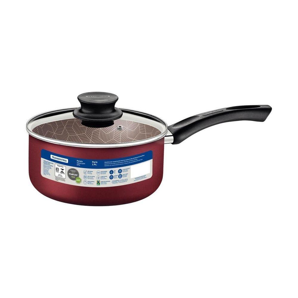 Panela Tramontina Paris 18cm Em Alumínio Com Revestimento Antiaderente Vermelha E Tampa De VidroA panela Tramontina Paris em alumínio com revestimento interno e externo em antiaderente Starflon Max vermelho com tampa de vidro 18 centímetros 2,1 litros vai tornar o preparo das suas receitas muito mais prático, sejam elas básicas ou mais elaboradas. É produzida em alumínio com espessura de 1,8 milímetros e revestimento interno e externo de antiaderente Starflon Max, ambas características que proporcionam um cozimento rápido e uniforme dos alimentos, evitam que eles grudem em sua superfície, e devido a isso, também a torna muito mais fácil de limpar. Seu cabo é em baquelite antitérmico, material que não aquece e deixa seu manuseio muito mais e confortável. A panela vem com tampa de vidro temperado, que facilita o preparo dos alimentos e auxilia sua visualização. Além de todas essas características, ela pode ir à máquina de lavar louças e vai garantir uma rotina muito mais prática!Recomendações de Uso:Antes do Uso: Lave com esponja macia, sabão neutro ou detergente líquido. Depois de secar, unte a área interna com óleo ou gordura e leve ao fogo por um ou dois minutos. Deixe esfriar e lave novamente. Seu utensílio Starflon está pronto para uso com ou sem gordura, sempre em fogo baixo ou médio (nunca superior a 260 °C). Para mexer os alimentos use somente utensílios de silicone, nylon ou madeira. Com o uso, o cabo e o pegador podem afrouxar devido à dilatação normal dos materiais. Reaperte apenas o suficiente, sem forçar. Limpeza: Evite a imersão do utensílio quente em água fria. Nunca utilize produtos abrasivos na lavagem. Se deixar queimar alimentos, umedeça a área e reserve até que possa remover os resíduos grudados com esponja e sabão. Para descarte do produto e embalagem siga as orientações de reciclagem vigentes.- Foto meramente ilustrativa.Informações Adicionais:- Pode ir à máquina de lavar louças facilitando seu dia a dia;- Tampa de vidro temperado, com saída de vapor e borda de aço inox;- Revestimento interno e externo de antiaderente Starflon Max livre de PFOA;- A capacidade volumétrica máxima para cozimento é de 3/4 da capacidade total da peça;- Cabo de baquelite antitérmico e pegador de nylon que oferecem durante o manuseio. ;