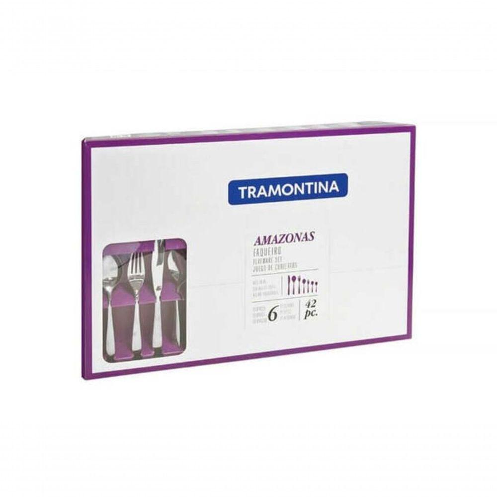 Faqueiro Tramontina Amazonas Em Aço Inox Com Facas Para Churrasco 42 PeçasUma mesa bem-posta é um presente quetodo mundo pode se dar todos os dias. Talheres e acessórios brilhantes, umatoalha bonita e pequenos toques de decoração tornam qualquer momento maisespecial. Afinal, uma boa refeição deve ser saboreada também com os olhos. Linha Amazonas, para uma rotina mais leve.Recomendações de Uso:Modo de uso: antes da primeira utilização, remova as eventuais etiquetas e lave com água quente, detergente e esponja macia. Outros tipos de produto como palha de aço, poderão riscar ou prejudicar o acabamento da peça. Enxágue cada item a fim de remover totalmente os resíduos dos produtos de limpeza, que, por serem abrasivos, podem danificar o inox. Sempre que possível, use água quente, pois renova o brilho da peça. Enxaguar e secar bem a peça após a lavagem, caso contrário, as substâncias químicas da água (cloro) poderão causar manchas. Evite atrito entre as peças durante o processo de lavagem e no armazenamento, para mantê-la sem riscos. Na máquina de lavar louças não carregue em demasia a cesta dos talheres. Separe bem as peças, pois o permanente entre elas, durante a secagem, poderá causar manchas. Retire os talheres logo que tenha terminado o ciclo enxaguar, a fim de que eles sejam secados manualmente. Evite o do produto com superfícies quentes, pois elas provocam a descoloração do material. Não guarde a peça em locais úmidos. A umidade também provoca manchas. Para manter o brilho, a Tramontina desenvolveu uma pasta especial para polir e remover manchas nos produtos de aço inox, que está disponível nos principais pontos de venda (94537000).- Tenha cuidado ao Manusear produtos cortantes e perfurantes e mantenha-os fora do alcance de crianças.- Foto meramente ilustrativa.Informações Adicionais:- Peças totalmente feitas de aço inox, altamente duráveis, mantêm suas características , preservando a beleza, a higiene e a durabilidade do material.- Colheres com bojo em formato simétrico e bordas cuidadosamente arredondadas.- Garfos com dentes polidos na parte interna, para proporcionar maior conforto no uso, com formato apropriado para a boca e bordas arredondadas.- Facas totalmente temperadas, que garantem maior durabilidade no fio de corte e maior resistência à corrosão, e por suas características de temperabilidade, não riscam as porcelanas.- Acabamento em brilho.- Próprias para uso diário combinam com qualquer ambiente.- Podem ser lavadas diariamente Na máquina de lavar louças.Composição:06 Colheres de Mesa - Comprimento: 195 mm - Espessura: 2,25 mm.06 Garfos de Mesa - Comprimento: 198 mm - Espessura: 2,0 mm.06 Facas para Churrasco - Comprimento: 230 mm - Espessura: 4,0 mm.06 Colheres para Sobremesa - Comprimento: 170 mm - Espessura: 1,8 mm.06 Garfos para Torta - Comprimento: 146 mm - Espessura: 1,2 mm.06 Colheres para Chá - Comprimento: 131 mm - Espessura: 1,2 mm.06 Colheres para Café - Comprimento: 101 mm - Espessura: 1,0 mm.
