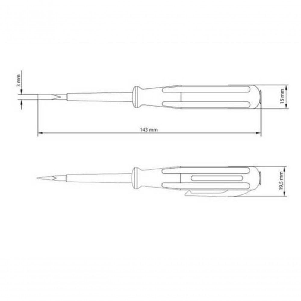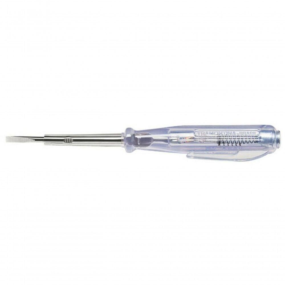Chave Teste Tramontina Master Com Ponta Chata Em Aço Especial 1/8x3"A Chave Teste Tramontina Master com Ponta Chata 1/8x3 Polegadas em Aço Especial é a ferramenta indispensável para garantir mais nas suas tarefas elétricas. Ideal para identificar a presença de corrente em instalações de 80 a 250 V, ela é perfeita tanto para profissionais da construção civil quanto para pequenos reparos domésticos. Sua ponta chata é precisa, e a haste é produzida em aço especial temperado com acabamento niquelado, o que confere resistência e durabilidade ao produto. Com design compacto e funcional, é fácil de manusear e de manter sempre por perto na caixa de ferramentas. Eficiência e com a qualidade Tramontina!Recomendações de Uso:Modo de uso: Use óculos, luvas e outros equipamentos de proteção de acordo com a tarefa a ser executada. Utilize chaves de fenda isoladas, identificadas pela marcação V, quando for necessário trabalhar em locais com corrente elétrica. Importante: nestes casos, inspecione a integridade da isolação elétrica, e, se aparecerem trincas na isolação, suspenda o uso imediatamente. Utilize chaves com ponta adequada para cada tipo de fenda, para realizar a tarefa de forma mais rápida e segura. Respeite o torque estabelecido por norma para cada bitola. Não utilize as chaves de fenda como formão ou alavanca. Não altere as dimensões da ponta para obter outro perfil. Armazene em limpo e seco.- Foto meramente ilustrativa.Informações Adicionais:- Lâmpada de neon;- Acabamento niquelado;- Apropriada para 80 - 250 V;- Haste em aço especial temperado;- Cabos injetados com material de alta resistência;- Circuito elétrico ativado através de botão na extremidade do cabo;- Os dimensionais das pontas são verificados com gabaritos-padrão, calibrados e certificados;- As hastes das chaves de fenda são testadas em máquinas de ensaio específicas, para verificar o perfeito balanço entre resistência mecânica e dureza.