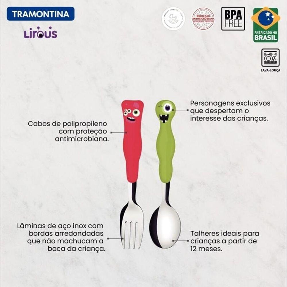 Jogo De Talheres Infantil Tramontina Lirous 2 Peças ColoridoCom o jogo de talheres infantil Tramontina Lirous colorido 02 peças você irá proporcionar uma refeição muito mais agradável e cheia de diversão para os pequenos. Os talheres são produzidos com lâminas em aço inox e cabos de polipropileno, o que lhes proporciona alta resistência e durabilidade. Eles ainda são coloridos e vão estimular ainda mais os sentidos das crianças!Recomendações de Uso:Recomenda-se o uso destes produtos para crianças com 12 meses ou cuidado ao manusear o garfo por ser produto da primeira utilização, lave bem as peças e produtos podem ir à máquina de lavar, porém não recomendamos usar produtos abrasivos como saponáceos, esponjas rígidas ou palhas de aço. Seque-os bem antes de descarte dos produtos e embalagem siga as orientações de reciclagem ção: Por razões de e saúde do seu filho, utilizar sempre os produtos com supervisão de um adulto. Não utilize os produtos caso apresentarem dano ou . Verifique sempre a temperatura do alimento antes da alimentação.Informações Adicionais:Lâminas de aço inox com bordas arredondadas que não machucam a boca da crianç de polipropileno que possuem maior resistência e durabilidade.Talheres com proteção antimicrobiana incorporada no processo de injeção que dura por toda vida útil do produto, inibindo o crescimento de bactérias e ir a máquina de lavar louças, facitando a limpeza.Produtos Livre de BPA: O Bisfenol-A é um componente químico na produção de alguns plásticos como o Policarbonato. Este componente pode ser prejudicial à saúde e por isso a Tramontina não o utiliza em seus produtos.