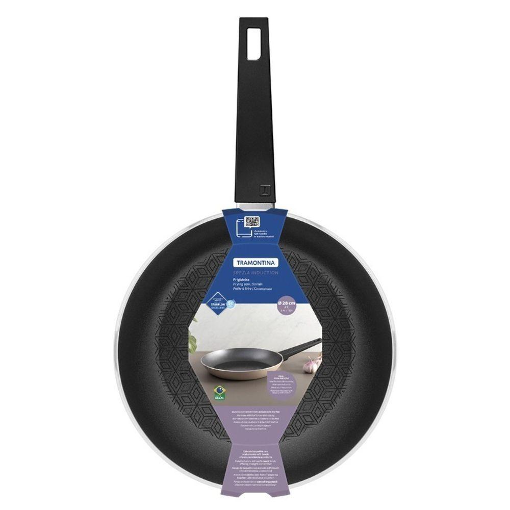 Frigideira Tramontina Spezia Induction Areia Em Alumínio Com Revestimento 28cmIdeal para preparar porções maiores com mais eficiência, a frigideira Tramontina Spezia Induction de 28 cm e 2 litros de capacidade é indispensável na sua cozinha. Seu corpo em alumínio com 3 mm de espessura garante aquecimento uniforme, enquanto o revestimento interno e externo em antiaderente Starflon Excellent evita que os alimentos grudem, tornando a limpeza muito mais simples. Os cabos em baquelite antitérmico asseguram conforto e durante o manuseio. Uma escolha prática e versátil, com todos os tipos de fogões, inclusive por indução.Recomendações de Uso:Modo de uso: ;A capacidade volumétrica máxima para cozimento é de 3/4 da capacidade total da peça. Posicione o cabo do utensílio voltado ao centro do fogão. Em fogões com grade, centralize a peça sobre a chama ou fonte de calor e alinhe o cabo com a grade. Utensílios quentes devem estar fora do alcance das crianças. Antes do primeiro uso, lave com esponja macia, sabão neutro ou detergente líquido. Depois de secar, unte a área interna com óleo ou gordura e leve ao fogo por um ou dois minutos. Deixe esfriar e lave novamente. Seu utensílio Starflon está pronto para uso com ou sem gordura, sempre em fogo baixo ou médio (nunca superior a 260 ºC). Em fogões de indução, usar somente em potência baixa ou média e evitar a movimentação da peça para prevenir riscos na superfície do fogão. Ao manusear seu utensílio aquecido, cuide para não arranhar/riscar o revestimento externo. Evite manchas, não deixando escorrer gordura e alimentos na área externa da peça. Caso esta situação ocorra, é recomendado realizar a limpeza imediata do com um pano umedecido em água. Para mexer os alimentos use somente utensílios de silicone, nylon ou madeira. Com o uso, a alça, o cabo e o pegador podem afrouxar devido à dilatação normal dos materiais. Reaperte apenas o suficiente, sem forçar. Limpeza: Evite a imersão do utensílio quente em água fria. Nunca utilize produtos abrasivos na lavagem. Se deixar queimar alimentos, umedeça a área e reserve até que possa remover os resíduos grudados com esponja e sabão. Para maior durabilidade não utilize em máquinas de lavar. Para descarte do produto e embalagem siga as orientações de reciclagem vigentes.- Foto meramente ilustrativa.Informações Adicionais:- Pegador de nylon;- indutivo 15,0 centímetros;- Tampa de alumínio: fácil limpeza e leveza no manuseio;- Para maior durabilidade não utilize em máquinas de lavar;- Fundo de indução: mais e rapidez no cozimento;- Alças de baquelite com acabamento soft-touch: oferecem resistência e conforto;- Revestimento interno e externo de antiaderente Starflon Excellent carbono que não gruda, é fácil de limpar, mais durável e não é prejudicial à saúde, pois é livre de PFOA.