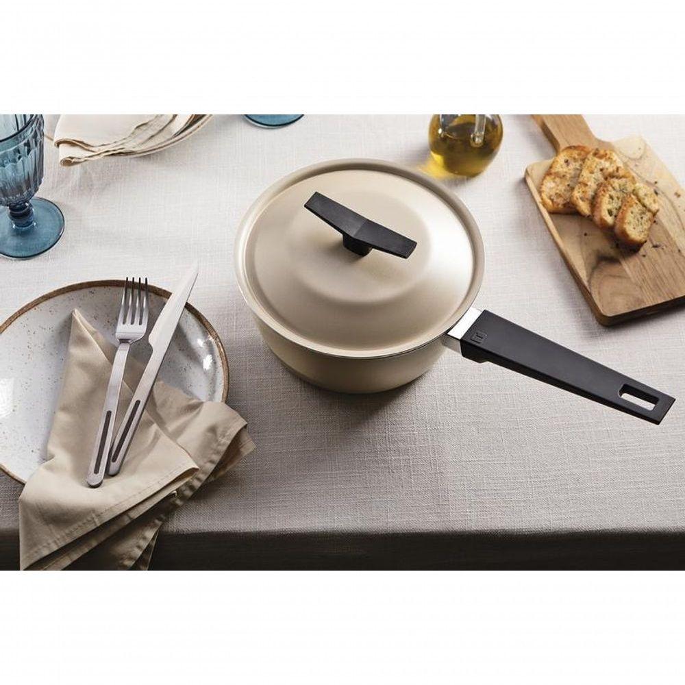 Panela Tramontina Spezia Induction Areia Em Alumínio Com Revestimento Em Antiaderente 18 CmIdeal para o preparo das receitas do dia a dia, a panela Tramontina Spezia Induction de 18 cm e 1,9 litro na cor champanhe combina desempenho e facilidade no uso. Fabricada em alumínio com revestimento interno e externo antiaderente Starflon Excellent, distribui o calor de forma uniforme, evita que os alimentos grudem e agiliza a limpeza. Um item funcional e moderno para quem valoriza praticidade na cozinha.Recomendações de Uso:Modo de uso: ;A capacidade volumétrica máxima para cozimento é de 3/4 da capacidade total da peça. Posicione o cabo do utensílio voltado ao centro do fogão. Em fogões com grade, centralize a peça sobre a chama ou fonte de calor e alinhe o cabo com a grade. Utensílios quentes devem estar fora do alcance das crianças. Antes do primeiro uso, lave com esponja macia, sabão neutro ou detergente líquido. Depois de secar, unte a área interna com óleo ou gordura e leve ao fogo por um ou dois minutos. Deixe esfriar e lave novamente. Seu utensílio Starflon está pronto para uso com ou sem gordura, sempre em fogo baixo ou médio (nunca superior a 260 ºC). Em fogões de indução, usar somente em potência baixa ou média e evitar a movimentação da peça para prevenir riscos na superfície do fogão. Ao manusear seu utensílio aquecido, cuide para não arranhar/riscar o revestimento externo. Evite manchas, não deixando escorrer gordura e alimentos na área externa da peça. Caso esta situação ocorra, é recomendado realizar a limpeza imediata do com um pano umedecido em água. Para mexer os alimentos use somente utensílios de silicone, nylon ou madeira. Com o uso, a alça, o cabo e o pegador podem afrouxar devido à dilatação normal dos materiais. Reaperte apenas o suficiente, sem forçar. Limpeza: Evite a imersão do utensílio quente em água fria. Nunca utilize produtos abrasivos na lavagem. Se deixar queimar alimentos, umedeça a área e reserve até que possa remover os resíduos grudados com esponja e sabão. Para maior durabilidade não utilize em máquinas de lavar. Para descarte do produto e embalagem siga as orientações de reciclagem vigentes.- Foto meramente ilustrativa.Informações Adicionais:- Pegador de nylon;- indutivo 15,0 centímetros;- Tampa de alumínio: fácil limpeza e leveza no manuseio;- Para maior durabilidade não utilize em máquinas de lavar;- Fundo de indução: mais e rapidez no cozimento;- Cabo de baquelite com acabamento soft-touch: oferecem resistência e conforto;- Revestimento interno e externo de antiaderente Starflon Excellent carbono que não gruda, é fácil de limpar, mais durável e não é prejudicial à saúde, pois é livre de PFOA.
