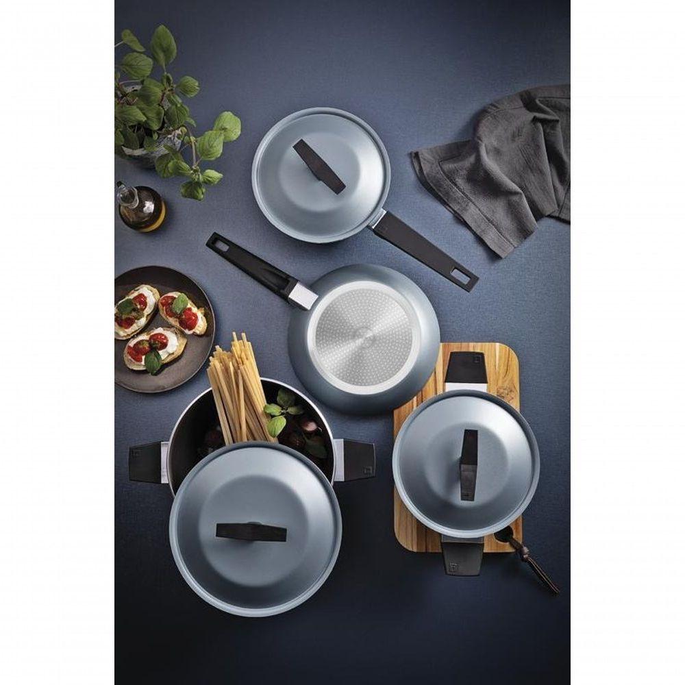Jogo De Panelas Tramontina Spezia Induction Azul Ardósia 4 Peças Em Alumínio Com Revestimento AntiaderenteMais leveza no preparo e resultados que fazem a diferença. O jogo de panelas Tramontina Spezia Induction, com 4 peças em alumínio e revestimento antiaderente Starflon Excellent na cor azul ardósia, garante cozimento rápido, uniforme e sem desperdício. As tampas em alumínio facilitam o uso no dia a dia, enquanto cabos e alças com acabamento soft-touch oferecem manuseio e confortável, mesmo durante o preparo prolongado. com todos os tipos de fogão, inclusive por indução, é uma escolha versátil para quem valoriza eficiência e visual moderno na cozinha.Recomendações de Uso:Modo de Uso: ;A capacidade volumétrica máxima para cozimento é de 3/4 da capacidade total da peça. Posicione o cabo do utensílio voltado ao centro do fogão. Em fogões com grade, centralize a peça sobre a chama ou fonte de calor e alinhe o cabo com a grade. Utensílios quentes devem estar fora do alcance das crianças. Antes do primeiro uso, lave com esponja macia, sabão neutro ou detergente líquido. Depois de secar, unte a área interna com óleo ou gordura e leve ao fogo por um ou dois minutos. Deixe esfriar e lave novamente. Seu utensílio Starflon está pronto para uso com ou sem gordura, sempre em fogo baixo ou médio (nunca superior a 260 ºC). Em fogões de indução, usar somente em potência baixa ou média e evitar a movimentação da peça para prevenir riscos na superfície do fogão. Ao manusear seu utensílio aquecido, cuide para não arranhar/riscar o revestimento externo. Evite manchas, não deixando escorrer gordura e alimentos na área externa da peça. Caso esta situação ocorra, é recomendado realizar a limpeza imediata do com um pano umedecido em água. Para mexer os alimentos use somente utensílios de silicone, nylon ou madeira. Com o uso, a alça, o cabo e o pegador podem afrouxar devido à dilatação normal dos materiais. Reaperte apenas o suficiente, sem forçar. Limpeza: Evite a imersão do utensílio quente em água fria. Nunca utilize produtos abrasivos na lavagem. Se deixar queimar alimentos, umedeça a área e reserve até que possa remover os resíduos grudados com esponja e sabão. Para maior durabilidade não utilize em máquinas de lavar. Para descarte do produto e embalagem siga as orientações de reciclagem vigentes.- Foto meramente ilustrativa.Informações Adicionais:- Tampas de alumínio: fácil limpeza e leveza no manuseio;- Pegadores de nylon. Para maior durabilidade não utilize em máquinas de lavar;- Cabos e alças de baquelite com acabamento soft-touch: oferecem resistência e conforto;- Fundo de indução: mais e rapidez no cozimento! indutivo 15,0 centímetros;- Revestimento interno e externo de antiaderente Starflon Excellent carbono que não gruda, é fácil de limpar, mais durável e não é prejudicial à saúde, pois é livre de PFOA.