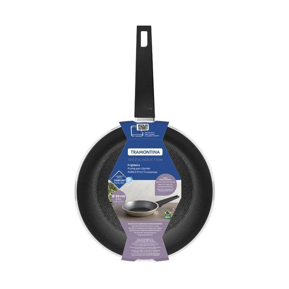 Frigideira Tramontina Spezia Induction Areia Em Alumínio Com Revestimento 20cmVersátil e fácil de usar, a frigideira Tramontina Spezia Induction com 20 cm de diâmetro e 0,95 litro de capacidade é uma ótima aliada para o preparo das suas receitas favoritas. Produzida em alumínio com revestimento interno e externo em antiaderente Starflon Excellent na cor areia, oferece aquecimento rápido e uniforme, evitando que os alimentos grudem e facilitando a limpeza. O cabo em baquelite antitérmico proporciona e conforto durante o manuseio. com todos os tipos de fogão, inclusive por indução, essa frigideira une praticidade com um visual moderno e elegante para a sua cozinha.Recomendações de Uso:Modo de uso: ;A capacidade volumétrica máxima para cozimento é de 3/4 da capacidade total da peça. Posicione o cabo do utensílio voltado ao centro do fogão. Em fogões com grade, centralize a peça sobre a chama ou fonte de calor e alinhe o cabo com a grade. Utensílios quentes devem estar fora do alcance das crianças. Antes do primeiro uso, lave com esponja macia, sabão neutro ou detergente líquido. Depois de secar, unte a área interna com óleo ou gordura e leve ao fogo por um ou dois minutos. Deixe esfriar e lave novamente. Seu utensílio Starflon está pronto para uso com ou sem gordura, sempre em fogo baixo ou médio (nunca superior a 260 ºC). Em fogões de indução, usar somente em potência baixa ou média e evitar a movimentação da peça para prevenir riscos na superfície do fogão. Ao manusear seu utensílio aquecido, cuide para não arranhar/riscar o revestimento externo. Evite manchas, não deixando escorrer gordura e alimentos na área externa da peça. Caso esta situação ocorra, é recomendado realizar a limpeza imediata do com um pano umedecido em água. Para mexer os alimentos use somente utensílios de silicone, nylon ou madeira. Com o uso, a alça, o cabo e o pegador podem afrouxar devido à dilatação normal dos materiais. Reaperte apenas o suficiente, sem forçar. Limpeza: Evite a imersão do utensílio quente em água fria. Nunca utilize produtos abrasivos na lavagem. Se deixar queimar alimentos, umedeça a área e reserve até que possa remover os resíduos grudados com esponja e sabão. Para maior durabilidade não utilize em máquinas de lavar. Para descarte do produto e embalagem siga as orientações de reciclagem vigentes.- Foto meramente ilustrativa.Informações Adicionais:- Pegador de nylon;- indutivo 15,0 centímetros;- Tampa de alumínio: fácil limpeza e leveza no manuseio;- Para maior durabilidade não utilize em máquinas de lavar;- Fundo de indução: mais e rapidez no cozimento;- Alças de baquelite com acabamento soft-touch: oferecem resistência e conforto;- Revestimento interno e externo de antiaderente Starflon Excellent carbono que não gruda, é fácil de limpar, mais durável e não é prejudicial à saúde, pois é livre de PFOA.