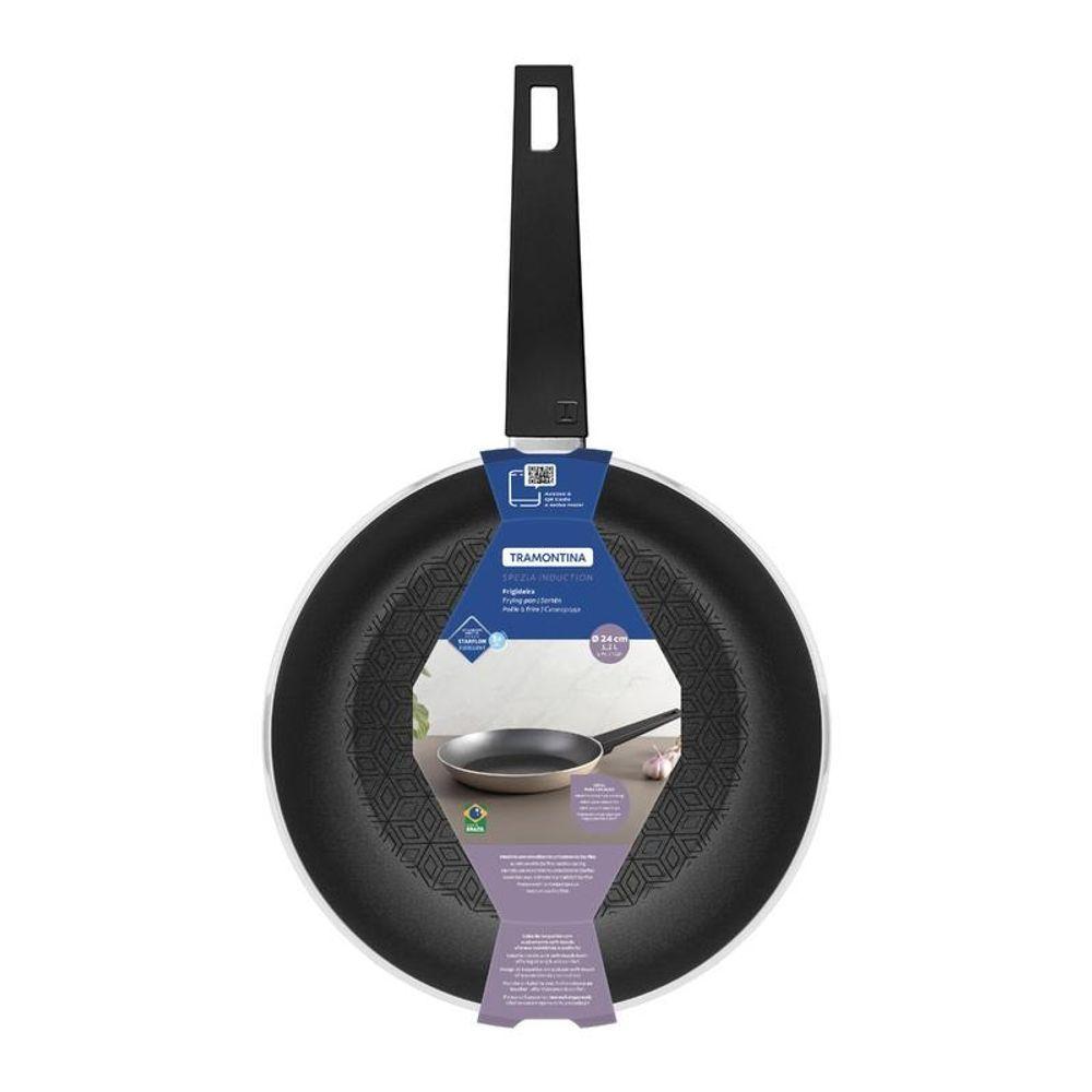 Frigideira Tramontina Spezia Induction Azul Ardósia Em Alumínio Com Revestimento 24cmPara quem valoriza praticidade e qualidade na cozinha, a frigideira Tramontina Spezia Induction de 24 cm de diâmetro e 1,2 litro de capacidade é uma excelente escolha. Produzida em alumínio com revestimento interno e externo em antiaderente Starflon Excellent na cor azul ardósia, proporciona aquecimento rápido e uniforme, além de evitar que os alimentos grudem, tornando a limpeza muito mais simples. Conta com cabo em baquelite soft-touch, que oferece manuseio confortável e mesmo durante o uso. com todos os tipos de fogão a gás, elétrico, vitrocerâmico e por indução, é a peça certa para o dia a dia na sua cozinha.Recomendações de Uso:Modo de uso: ;A capacidade volumétrica máxima para cozimento é de 3/4 da capacidade total da peça. Posicione o cabo do utensílio voltado ao centro do fogão. Em fogões com grade, centralize a peça sobre a chama ou fonte de calor e alinhe o cabo com a grade. Utensílios quentes devem estar fora do alcance das crianças. Antes do primeiro uso, lave com esponja macia, sabão neutro ou detergente líquido. Depois de secar, unte a área interna com óleo ou gordura e leve ao fogo por um ou dois minutos. Deixe esfriar e lave novamente. Seu utensílio Starflon está pronto para uso com ou sem gordura, sempre em fogo baixo ou médio (nunca superior a 260 ºC). Em fogões de indução, usar somente em potência baixa ou média e evitar a movimentação da peça para prevenir riscos na superfície do fogão. Ao manusear seu utensílio aquecido, cuide para não arranhar/riscar o revestimento externo. Evite manchas, não deixando escorrer gordura e alimentos na área externa da peça. Caso esta situação ocorra, é recomendado realizar a limpeza imediata do com um pano umedecido em água. Para mexer os alimentos use somente utensílios de silicone, nylon ou madeira. Com o uso, a alça, o cabo e o pegador podem afrouxar devido à dilatação normal dos materiais. Reaperte apenas o suficiente, sem forçar. Limpeza: Evite a imersão do utensílio quente em água fria. Nunca utilize produtos abrasivos na lavagem. Se deixar queimar alimentos, umedeça a área e reserve até que possa remover os resíduos grudados com esponja e sabão. Para maior durabilidade não utilize em máquinas de lavar. Para descarte do produto e embalagem siga as orientações de reciclagem vigentes.- Foto meramente ilustrativa.Informações Adicionais:- Pegador de nylon;- indutivo 15,0 centímetros;- Tampa de alumínio: fácil limpeza e leveza no manuseio;- Para maior durabilidade não utilize em máquinas de lavar;- Fundo de indução: mais e rapidez no cozimento;- Alças de baquelite com acabamento soft-touch: oferecem resistência e conforto;- Revestimento interno e externo de antiaderente Starflon Excellent carbono que não gruda, é fácil de limpar, mais durável e não é prejudicial à saúde, pois é livre de PFOA.