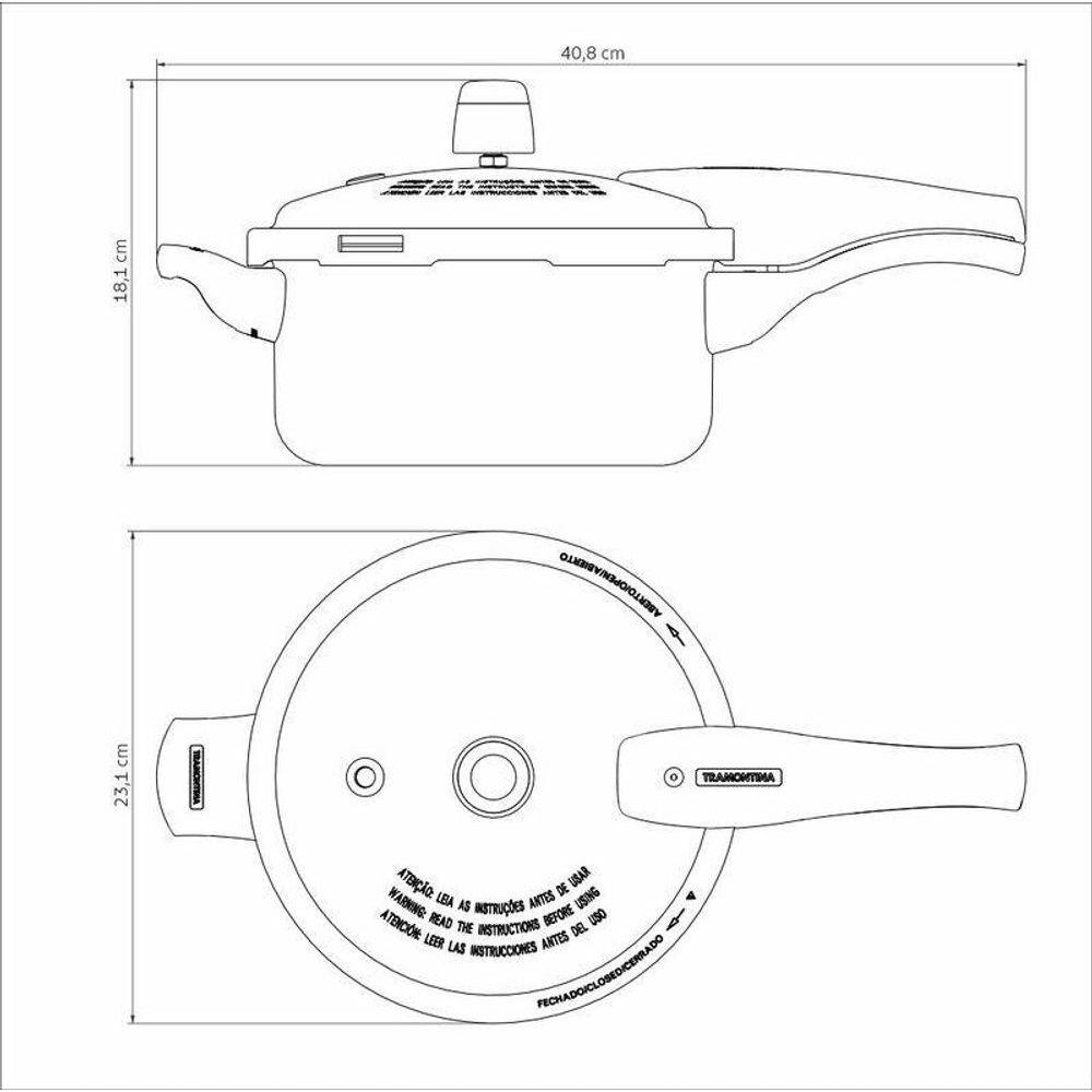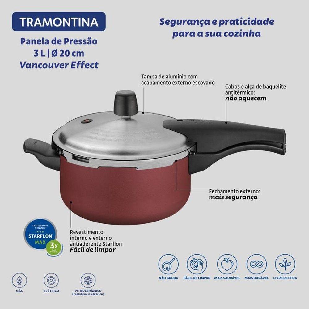 Panela De Pressão Tramontina Vancouver Alumínio Com Revestimento Antiaderente 20cm 3 Litros VermelhoAgilidade no preparo e no manuseio fazem toda a diferença na rotina da cozinha. A panela de pressão Tramontina Vancouver, com 20 cm de diâmetro e capacidade para 3 litros, é feita em alumínio com revestimento interno e externo antiaderente Starflon Max, que evita que os alimentos grudem e facilita a limpeza. Ideal para quem busca eficiência no dia a dia, ela distribui o calor de forma uniforme, acelerando o cozimento. Conta com três válvulas de e cabos em baquelite antitérmico, que tornam o uso mais e confortável. Na cor vermelha, leva mais cor e praticidade ao preparo das suas receitas preferidas, com a confiabilidade da Tramontina.Recomendações de Uso:Modo de uso: ;A capacidade volumétrica máxima para cozimento é de 2/3 da capacidade total da peça. Para manter sua panela de pressão bonita, recomenda-se lavar somente com detergente neutro e esponja macia. Ao utilizar utensilios quentes tenha cuidado redobrado. Se necessário, utilize proteção para as mãos e mantenha fora do alcance de crianças. Para sua , ao utilizar utensílios com cabos, mantenha os mesmos sempre voltados para o centro do fogão. Ao utilizar seu utensílio em fogões com grade, mantenha a peça centralizada e alinhe o cabo com a grade, para reduzir o risco de queda. Para uma maior vida útil do anel de vedação da tampa, unte-o periodicamente com óleo de cozinha. Substitua este anel de vedação a cada 2 anos para um bom desempenho do produto, ou sempre que estiver . A válvula de trabalho deve ser substituída a cada 5 anos para um bom desempenho do produto, ou sempre que estiver danificada. Antes do primeiro uso, lave com esponja macia, sabão neutro ou detergente líquido. Depois de secar, unte a área interna com óleo ou gordura e leve ao fogo por um ou dois minutos. Deixe esfriar e lave novamente. Seu utensílio Starflon está pronto para uso com ou sem gordura, sempre em fogo baixo ou médio (nunca superior a 260 °C). Para mexer os alimentos use somente utensílios de silicone, nylon ou madeira. Com o uso, o cabo e o pegador podem afrouxar devido à dilatação normal dos materiais. Reaperte apenas o suficiente, sem forçar. Limpeza: Evite a imersão do utensílio quente em água fria. Nunca utilize produtos abrasivos na lavagem. Se deixar queimar alimentos, umedeça a área e reserve até que possa remover os resíduos grudados com esponja e sabão. Para descarte do produto e embalagem siga as orientações de reciclagem vigentes. Para consultar uma assistência técnica autorizada acesse o site e busque pelo produto "Panela de Pressão de Alumínio".- Foto meramente ilustrativa.Informações Adicionais:- Alça, cabos superior e inferior de baquelite antitérmico que oferecem durante o manuseio;- Com revestimento interno e externo de antiaderente Starflon Max que não gruda, é fácil de limpar, mais durável e não é prejudicial à saúde. ;