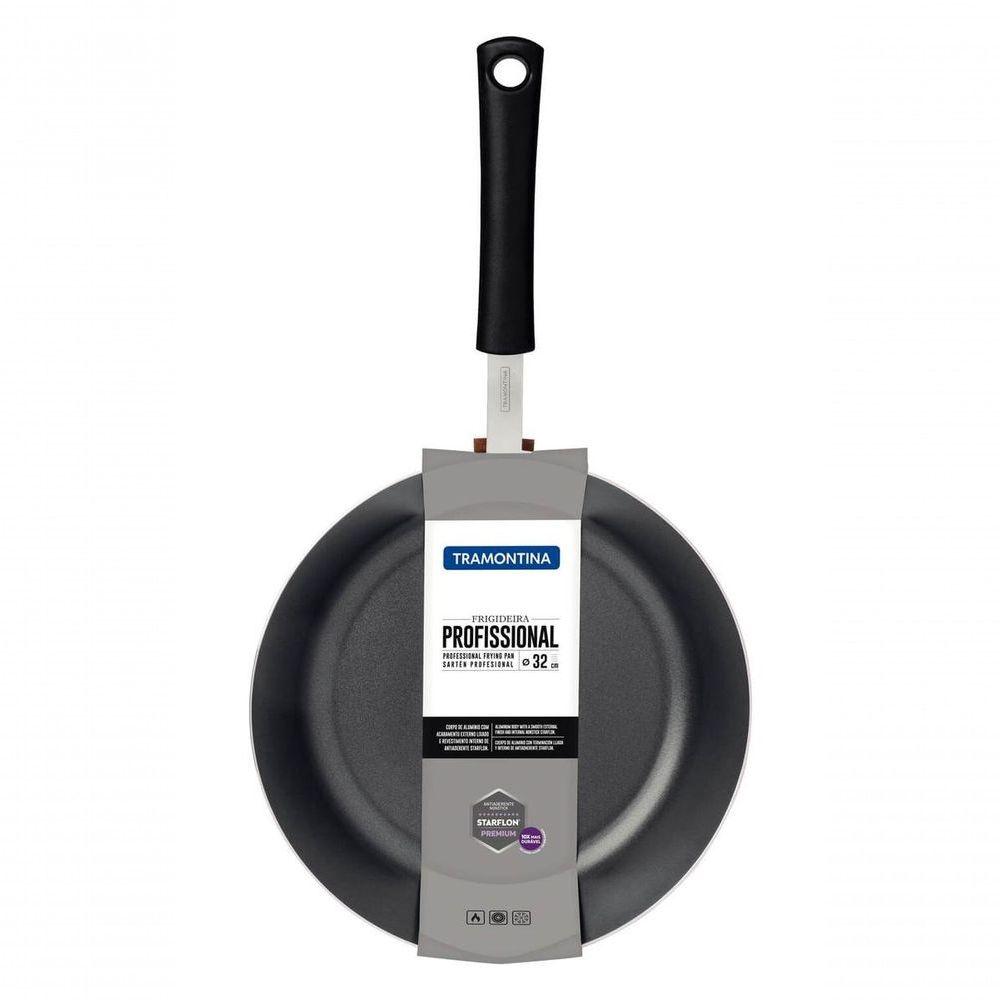 Frigideira Alumínio Antiaderente 32cm Tramontina Ideal para saltear e finalizar pratos, a frigideira Tramontina em alumínio com revestimento antiaderente Starflon Premium e acabamento externo lixado 32 centímetros de diâmetro 4,9 litros, ;proporcionam agilidade no preparo, sem que os alimentos grudem em sua superfície. O acabamento externo é lixado e seu cabo é em aço inox com baquelite antitérmico, material resistente a alta temperaturas e que torna o manuseio e confortável!Recomendações de Uso:Antes do uso: ;Antes de ;utilizar ;o produto pela primeira vez, remova as eventuais etiquetas, lave interna e externamente o utensílio, usando apenas uma esponja macia, ;sabão neutro ou detergente líquido. Enxugue bem com um pano seco e unte todas as partes internas com óleo ou gordura. Esquente o utensílio em temperatura baixa por um ou dois minutos. Deixe-o esfriar, lave e enxugue novamente. A partir daí poderá ser com ou sem gordura.Modo de uso:Durante o uso, evite esquentar o utensílio vazio. Use sempre aquecimento baixo ou médio para conservar o revestimento do utensílio. Para mexer ou retirar o alimento, utilize somente utensílios de plástico, madeira ou silicone, que não danificam a superfície com antiaderente. Após uso evite imersão do ;utensílio quente em água fria. Mesmo depois de vários usos, nunca utilize produtos abrasivos na lavagem. Podem ser levados, diariamente, à maquina de lavar louça.- Foto meramente ilustrativa ;Informações Adicionais:- Livre de PFOA;- Acabamento externo lixado;- Maior resistência antitérmica;- Cabo de baquelite antitérmico;- Sistema de fixação do cabo com 2 rebites;- Corpo de alumínio com espessura de 2 mm;- Maior e estabilidade durante o uso;- Revestimento interno de antiaderente Starflon Premium;- Pode ser utilizada nos fogões: gás, elétrico e vitrocerâmico - resistência elétrica.