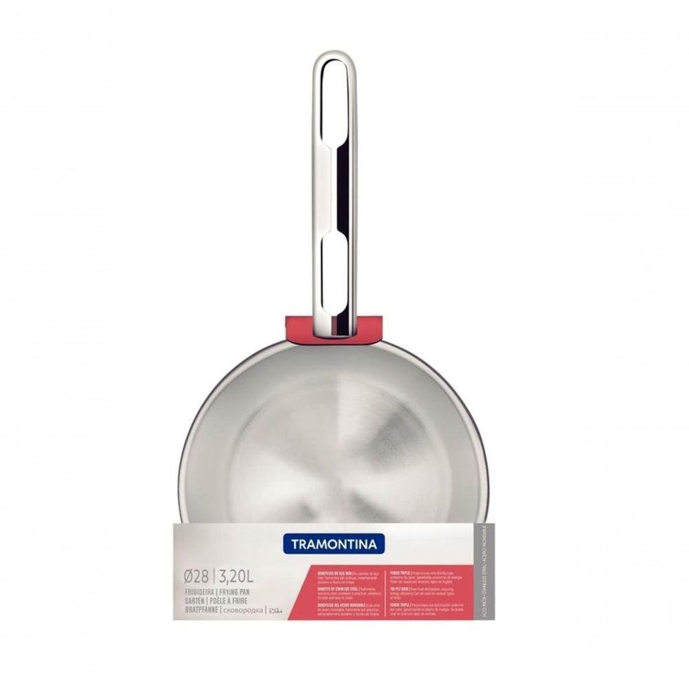 Frigideira Tramontina Allegra Aço Inox 28cmCom um elegante acabamento em alto brilho, ;Frigideira Tramontina Allegra em Aço Inox com Fundo Triplo 28 cm de diâmetro ;é a peça certa para aliar praticidade e tecnologia. ;Produzida totalmente em aço inox e com fundo triplo (aço inox + alumínio + aço inox) presente na peça distribui o calor uniformemente, proporcionando um cozimento mais rápido e economizando mais energia. Muito versátil, pode ir ao forno para gratinar ou finalizar pratos, além de poder ser utilizada em diferentes fogões. É muito fácil de limpar! É a companhia perfeita para você realizar suas melhores receitas.Recomendações de Uso:Modo de Uso: A capacidade volumétrica máxima para cozimento é de 3/4 da capacidade total da peça. Antes de utilizar o produto, remova as eventuais etiquetas e lave com água quente e detergente. Use uma fonte de calor brando para evitar que o alimento grude no fundo da frigideira. O fundo triplo distribui uniformemente o calor, não sendo necessário o fogo alto. E, além disso, você economiza energia. Quando a frigideira for utilizada no fogão a gás, a chama não deve ultrapassar a base da frigideira. No caso de uso de chapa elétrica, a chapa deverá ter diâmetro igual ou inferior ao da frigideira. O cabo de inox aquece durante o cozimento. Aconselhamos o uso de luvas durante o manuseio. Alguns alimentos que possuem amido poderão deixar manchas na parte interna da frigideira durante o cozimento. Para remover facilmente as manchas, passe um pano umedecido com suco de limão ou vinagre, ou use a Pasta para Polir e Remover Manchas Tramontina. Evite deixar alimento na frigideira por muito tempo; o sal também pode provocar manchas. Depois da lavagem, sempre que possível, enxágue a frigideira com água quente e seque-a imediatamente para que ela mantenha o brilho , pois o cloro e as substâncias contidas na água podem deixar manchas. Pode ir ao forno em temperatura máxima de 260°C, podendo haver mudança na coloração. Não deixe a frigideira vazia sobre uma fonte de calor. Deixe a frigideira quente somente em superfícies resistentes ao calor. Se deixar queimar alimentos, deixe a frigideira de molho em água durante algum tempo antes de usá-la. Sempre deixe a frigideira esfriar antes de mergulhar na água.- Foto meramente ilustrativa.Informações Adicionais:- Pode ser lavada diariamente na máquina de lavar louças;- Pode ir ao forno para gratinar ou finalizar pratos, na temperatura máxima de 260°C;- Totalmente feita de aço inox, por isso não solta nenhum resíduo nos alimentos, mantendo-os saudáveis;- Fundo triplo (aço inox + alumínio + aço inox) distribui o calor uniformemente, proporcionando um cozimento mais rápido e uniforme, economizando energia e deixando os alimentos aquecidos por mais tempo.