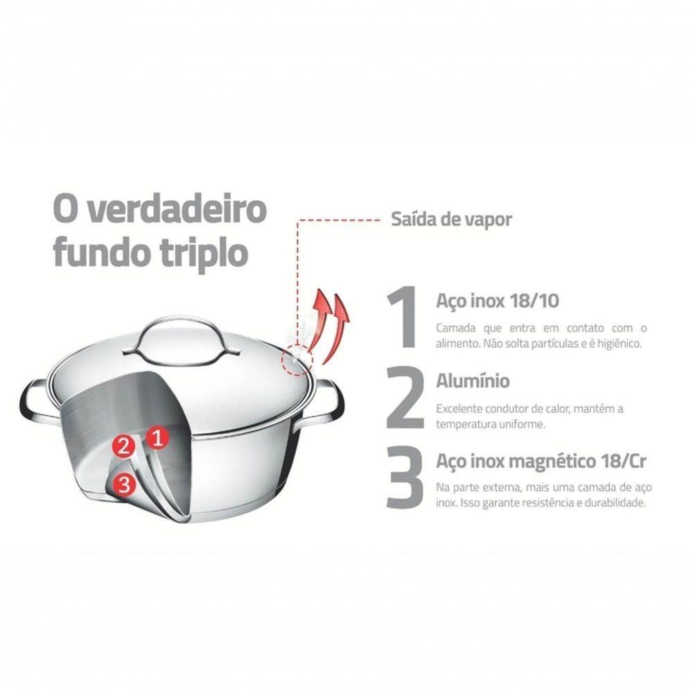 Caçarola Tramontina Allegra 20cm Em Aço InoxO design clean da linha Allegra foi criado para tornar mais simples as tarefas de forno e fogão. Totalmente feita em aço inox, por isso não solta nenhum resíduo nos alimentos, mantendo-os saudáveis. Altamente durável, mantém as características originais, preservando a beleza, a higiene e a durabilidade do material.Recomendações de Uso:Antes do uso: Antes de utilizar o produto, remover as eventuais etiquetas e lavar com água quente e detergente.Modo de uso: Use uma fonte de calor brando para evitar que o alimento grude no fundo da caçarola. O fundo triplo distribui uniformemente o calor, não sendo necessário o fogo alto. E, além disso, você economiza energia. Quando a caçarola for utilizada no fogão a gás, a chama não deve ultrapassar a base da caçarola. No caso de uso de chapa elétrica, a chapa deverá ter diâmetro igual ou inferior ao da caçarola. Sempre dissolva o sal em água fervendo ou com os alimentos, mexendo os ingredientes no início do cozimento. Não aqueça o alimento colocando uma caçarola do mesmo diâmetro sobre a outra. Esse procedimento é perigoso, pois cria vácuo e impossibilita a retirada do mesmo. Se a tampa da caçarola de aço inox Tramontina ficar presa pelo efeito do vácuo durante o resfriamento, basta puxar ou aquecer novamente até neutralizar o efeito do vácuo. As alças de inox aquecem durante o cozimento. Aconselhamos o uso de luvas durante o manuseio. Alguns alimentos que possuem amido, como massa e arroz, poderão deixar manchas na parte interna da caçarola durante o cozimento. Para remover facilmente as manchas, passe um pano umedecido com suco de limão ou vinagre, ou use a Pasta para Polir e Remover Manchas Tramontina. Evite deixar alimento na caçarola por muito tempo o sal também pode provocar manchas. Para que a caçarola de aço inox fique sempre bonita e com brilho, recomendamos que seja lavada somente com detergente e esponja. A Tramontina desenvolveu uma pasta especial para polir e remover manchas nos produtos de aço inoxidável, que está disponível nos principais pontos de venda. Depois da lavagem, sempre que possível, enxágue a caçarola com água quente e seque-a imediatamente, para que ela mantenha o brilho original, pois o cloro e as substâncias contidas na água podem deixar manchas na caçarola. Não deixe a caçarola vazia sobre uma fonte de calor. Deixe caçarolas quentes somente em superfícies resistentes ao calor.- sem EmbalagemInformações Adicionais:- O fundo triplo (aço inox + alumínio + aço inox) distribui o calor uniformemente, proporcionando um cozimento mais rápido e uniforme, economizando energia e deixando os alimentos aquecidos por mais tempo.- Pode ir ao forno para gratinar ou finalizar pratos, na temperatura máxima de 260°C.- Possui design diferenciado e moderno, com acabamento em alto brilho.- desenho limpo e sem cantos Torna a limpeza mais fácil.- Tampa com saída de vapor e encaixe perfeito.- Pode ser lavada diariamente Na máquina de lavar louças.- Pode ser utilizada nos fogões: gás, elétrico, vitrocerâmico e indução.