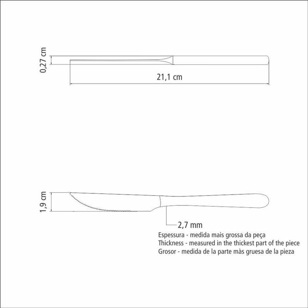 Faca Para Churrasco Tramontina Havaí Em Aço InoxA Faca para Churrasco Tramontina Havaí em Aço Inox é indispensável para quem adora reunir a família e os amigos em torno de um bom churrasco. Produzida em aço inox de alta qualidade, ela passa por processo térmico que garante resistência à corrosão, durabilidade do fio de corte e a vantagem de não riscar as porcelanas. Além disso, conta com acabamento em brilho que proporciona um toque de elegância à mesa. Para completar, pode ser levada ao lava-louças diariamente sem perder suas características originais, unindo praticidade, beleza e eficiência em cada uso.Recomendações de Uso:Antes do uso: Antes de utilizar o produto novo, remova as eventuais etiquetas e lave-o com água quente e detergente.Modo de uso: Durante a lavagem use somente esponja macia, outros tipos de produtos, como palha de aço, poderão riscar ou prejudicar o brilho dos talheres. Enxágue bem cada peça a fim de remover totalmente os resíduos dos produtos de limpeza, que por serem abrasivos, podem danificar o inox. Após a lavagem enxugue os talheres, pois as substâncias químicas contidas na água poderão causar manchas. Sempre que possível use água quente, pois renova o brilho dos talheres. Evite o contato das peças com superfícies quentes, pois podem provocar a descoloração do produto. Quando usar a máquina de lavar louça, recomendamos retirar os talheres logo que tenha terminado o ciclo "enxaguar", a fim de que os mesmos sejam secados manualmente.- Foto meramente ilustrativa.Informações Adicionais:- Pode ser lavada diariamente na máquina de lavar louças;- Totalmente feita de aço inox, mantém suas características originais, preservando a beleza, a higiene e a durabilidade do material;- Faca totalmente temperada, que garante maior durabilidade no fio de corte e maior resistência à corrosão, e por sua característica de temperabilidade, não risca as porcelanas.