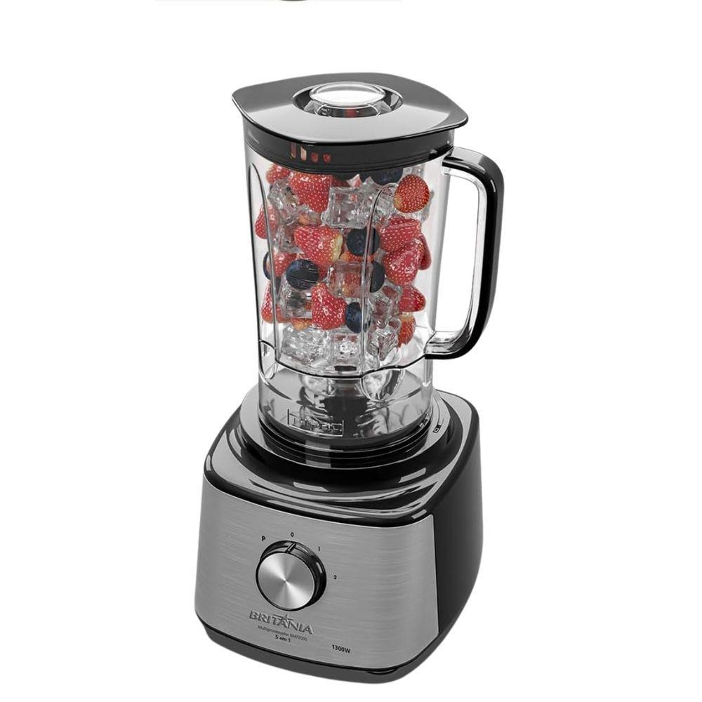 Multiprocessador Britânia 5 Em 1 Bmp2000 1300W 110VMultiprocessador Britânia 5 em 1 BMP2000 1300W 127V – Potência, Versatilidade e Praticidade na Sua Cozinha!Transforme o preparo das suas receitas em um momento rápido, prático e delicioso com o Multiprocessador Britânia BMP2000!Com 1300W de potência, ele é o aliado ideal para quem busca desempenho e multifuncionalidade em um só produto.O 5 em 1 da Britânia combina as funções de processador, liquidificador, fatiador, ralador e espremedor de frutas, oferecendo tudo o que você precisa para preparar refeições completas com muito mais agilidade.Com design moderno e acabamento elegante, o BMP2000 traz eficiência e estilo para a sua cozinha! Funções e Benefícios: 5 em 1: processa, mistura, tritura, fatia, rala e espreme frutas com facilidade. Potência de 1300W: garante alta performance até nos alimentos mais duros. Copo do liquidificador com 3L (capacidade total): ideal para sucos, vitaminas e massas leves. Lâminas em aço inox: mais durabilidade e precisão no corte. Espremedor de frutas integrado: prepare sucos frescos e naturais em segundos. Função Pulsar e 2 velocidades: controle total da textura dos alimentos. Fácil de desmontar e limpar: praticidade no dia a dia. Sistema de trava de segurança: o aparelho só liga quando está corretamente montado.Vantagens que Você Vai Amar:Substitui vários eletrodomésticos, economizando espaço e tempo.Ideal para picar legumes, preparar massas, molhos, sucos e muito mais.Perfeito para famílias que buscam praticidade e eficiência.Design moderno que combina com qualquer estilo de cozinha. Especificações Técnicas: Marca: BritâniaModelo: BMP2000Cor: PretoPotência: 1300WTensão: 127VCapacidade total do copo: 3 litrosCapacidade útil: 2 litrosVelocidades: 2 + PulsarLâminas: Aço inoxFunções: Processador, liquidificador, ralador, fatiador e espremedor Conteúdo da Embalagem:1 Multiprocessador Britânia BMP20001 Copo de Liquidificador1 Conjunto de Lâminas e Acessórios1 Espremedor de Frutas1 Manual de Instruções