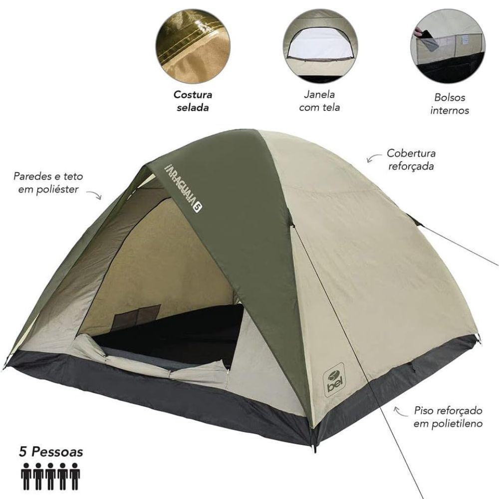 Bel - Barraca Araguaia Alta Premium 5 PessoasPerfeita para campistas que buscam praticidade, conforto e segurança, a Barraca Araguaia BEL – 5 Pessoas foi desenvolvida para quem ama explorar a natureza com tranquilidade. Leve e fácil de montar, ela oferece um ambiente protegido e ventilado, garantindo noites confortáveis em suas aventuras em campings, praias, montanhas ou áreas próximas a rios e lagos.Equipada com tela mosquiteiro, a barraca impede a entrada de insetos e melhora a circulação de ar, mantendo o interior fresco e agradável. Seu piso reforçado em PE e o teto em poliéster com coluna d’água de 1.000 mm proporcionam proteção contra umidade e chuvas leves, enquanto a estrutura com varetas em fibra de vidro entrega maior resistência e estabilidade.Com amplo espaço interno e altura confortável, oferece mobilidade e acomodação perfeita para até 5 pessoas, além de bolsos organizadores que facilitam o armazenamento de pequenos objetos. Para completar, acompanha sacola tiracolo que facilita o transporte.Características do ProdutoCapacidade para 5 pessoasTeto e paredes em poliéster – resistência e durabilidadePiso reforçado em PE (polietileno) – proteção contra umidade do soloVaretas em fibra de vidro – mais firmeza e segurançaColuna d’água: 1.000 mm – proteção contra chuva leveTela mosquiteiro – ventilação e proteção contra insetosCosturas seladas para maior impermeabilidade1 janela com tela para melhor circulação de arBolsos internos para pequenos objetosLeve, prática e fácil de montarAcompanha sacola tiracolo para transporteIdeal ParaCamping e acampamentos familiaresPraias, lagoas e áreas naturaisPesca, trilhas e viagens ao ar livreAventureiros iniciantes e experientesDesbrave a natureza com segurança e conforto com a Barraca Araguaia BEL – 5 Pessoas. Uma aliada perfeita para noites tranquilas e momentos inesquecíveis ao ar livre!