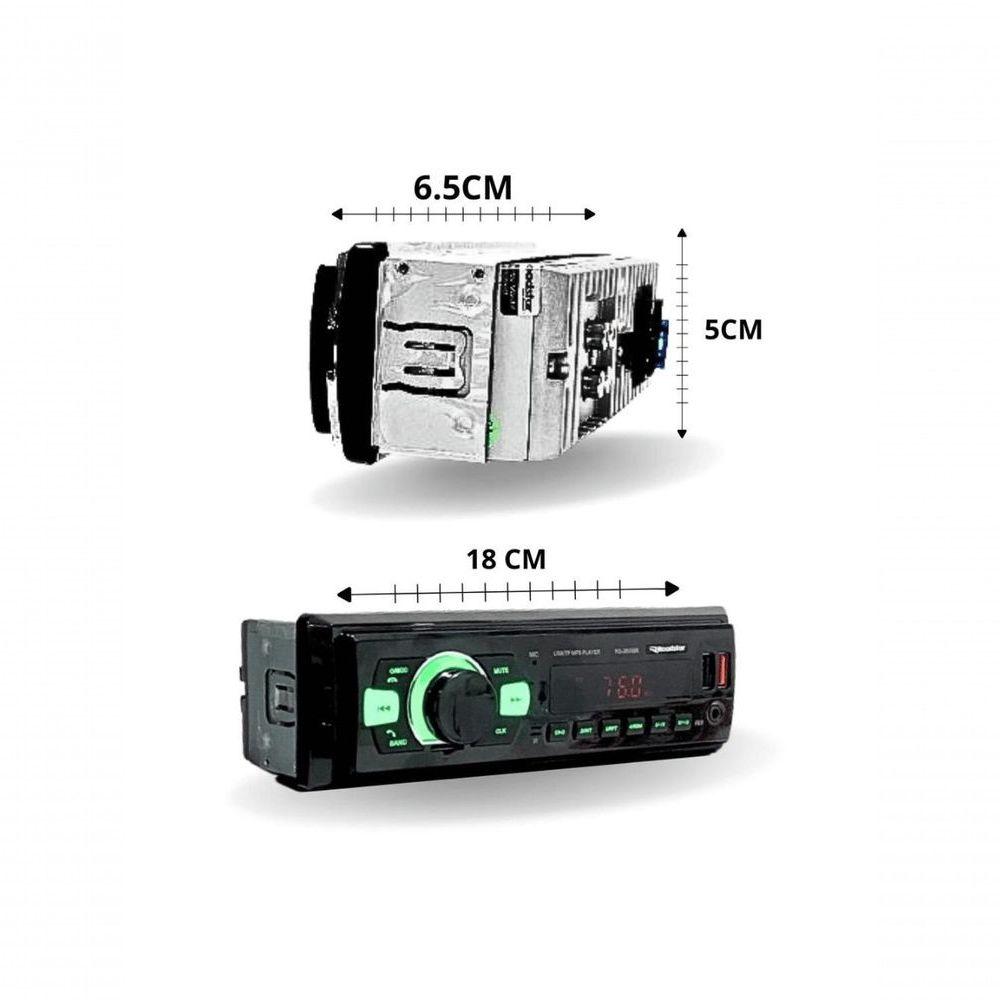 Auto Radio Bluetooth Roadstar Rs2605br EsAUTO RÁDIO FM RS-2605BR plusRecarregue seu celular enquanto escuta suas playlists- MP3 PLAYER- 4 canais de 48 Watts- DUAL USBCONECTOR ISO USB CHARGER SD/USB RÁDIOFM- BLUETOOTH CONTROLE PAINEL 7 CORES- Controle Remoto e Controle por Aplicativo *Imagens meramente ilustrativas. - Rádio FM com memória para 18 estações- Conexão Bluetooth- Reprodução de arquivos MP3 e WMA- Entrada para pen drive até 32 GB- USB Charger (para carregar celular)- Entrada auxiliar- Visor LED- Botões em RGB- Controle remoto- Controle via aplicativo- 4 saídas RCA de áudio- Conector ISOAUTO RÁDIO FM RS-2605BR plusRecarregue seu celular enquanto escuta suas playlists- MP3 PLAYER- 4 canais de 48 Watts- DUAL USBCONECTOR ISO USB CHARGER SD/USB RÁDIOFM- BLUETOOTH CONTROLE PAINEL 7 CORES- Controle Remoto e Controle por Aplicativo *Imagens meramente ilustrativas. - Rádio FM com memória para 18 estações- Conexão Bluetooth- Reprodução de arquivos MP3 e WMA- Entrada para pen drive até 32 GB- USB Charger (para carregar celular)- Entrada auxiliar- Visor LED- Botões em RGB- Controle remoto- Controle via aplicativo- 4 saídas RCA de áudio- Conector ISO