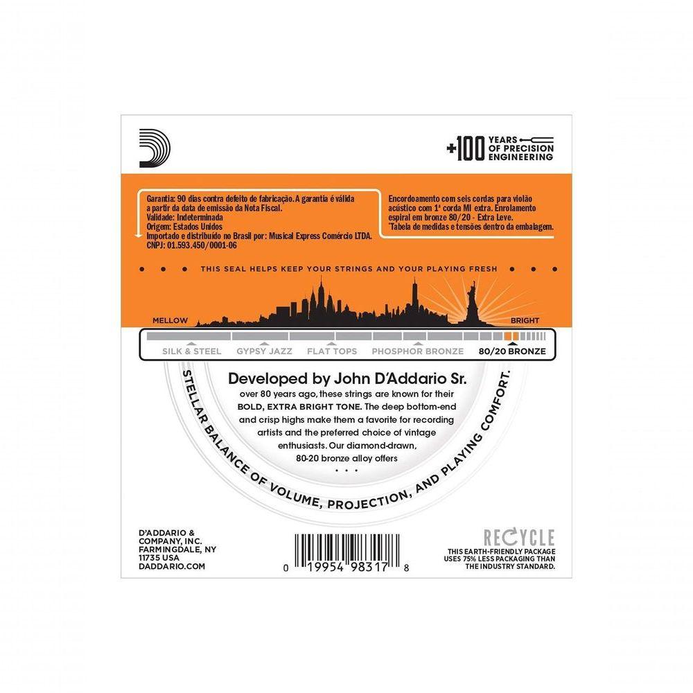Encordoamento Para Violão Aço Ej10-b 80/20 BronzeA liga de bronze 80/20, foi a liga originalmente selecionada para instrumentos acústicos pelo Sr. John D Addario e John D'Angelico por volta de 1930. As 80/20 são populares para gravação graças ao timbre encorpado e grave cultuado por muitos tradicionalistas por seu significado histórico.Código - Nota - pol - mm - lbs. - kgPL010 - E - 0.010 - 0.25 - 16.20 - 7.35PL014 - B - 0.014 - 0.36 - 17.8 - 8.07BW023 - G - 0.023 - 0.58 - 27.2 - 12.34BW030 - D - 0.030 - 0.76 - 26.2 - 11.88BW039 - A - 0.039 - 0.99 - 24.5 - 11.11]]>