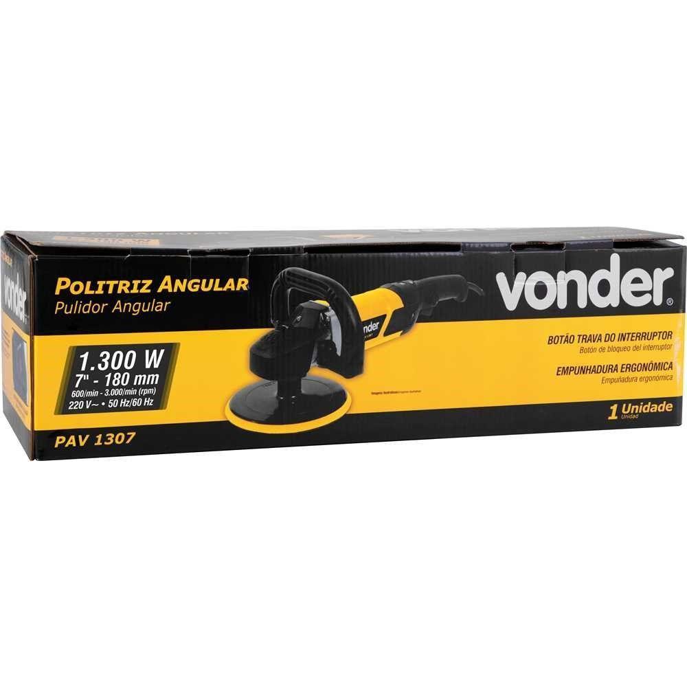 Politriz Angular 7'' Pav1307 220V VonderCod. do Fornecedor: 6001137220Marca: VonderConteúdo da embalagem: 1 Politriz Angular 7'' PAV1307 220V VonderAcompanha: 1 punho auxiliar, 1 alça tipo D, 1 disco de borracha de 7 com sistema fixa fácil, 1 boina de lã 7 de amarrar, 1 boina de espuma de 7, 1 adaptador para boina dupla face.Possui velocidade variável, que pode ser adequada a diferentes necessidades de uso através do botão de ajuste, botão trava do interruptor e empunhadura ergonômica, que conferem maior conforto durante o uso e motor com dupla isolação, garantindo maior ao operador. Conta ainda com sistema que mantém a velocidade constante nas aplicações e garante maior durabilidade, resistência e desempenho.Ideal para profissionais de polimento e espelhamento, utiliza boinas com sistema fixa fácil de lã, espuma ou pano, boinas simples de amarrar ou boinas dupla face. A ferramenta deve ser utilizada somente com acessórios compatíveis.Garantia legal: 90 dias + Garantia contratual: 9 meses (Para locadoras, garantia única e exclusiva de 90 dias)Detalhes TécnicosModelo: PAV 1307Tensão: 220 V~Frequência: 50/60 HzPotência: 1300 WDiâmetro da boina de lã da politriz: 7 - 180 mmDiâmetro do disco de borracha/PVC da politriz: 7 - 180 mmRotação da politriz (rpm): 600/min - Rosca do eixo: M 14Incerteza da aceleração transmitida nas mãos - braços do operador - k: 1,5 m/s²Aceleração transmitida nas mãos - braços do operador - ah: 3,7 m/s²Segue norma: ABNT NBR IEC 60745-1 e ABNT NBR IEC 60745-2-3Massa aproximada (peso): 3,5 kg Produto: Politriz