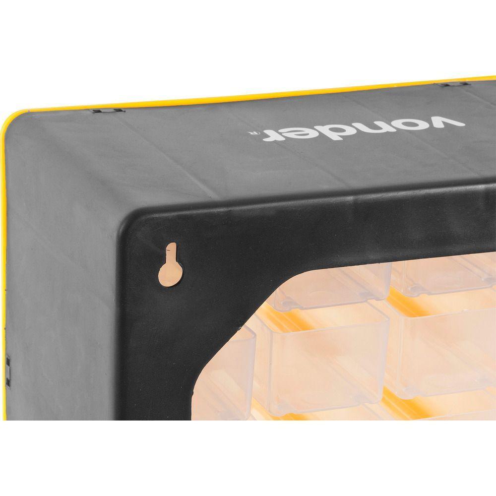 Organizador Plástico 505x160x400mm 64 Bandejas Opv310 VonderOrganize seu espaço com eficiência e praticidade com o Organizador Plástico Vonder, um produto ideal para quem busca otimizar o armazenamento de pequenos itens. Com 64 gavetas transparentes, este organizador permite uma visualização rápida e fácil dos conteúdos, economizando tempo e facilitando o acesso aos seus acessórios. Seja para guardar material de pesca, parafusos, pregos, porcas ou até mesmo remédios, este organizador é a solução perfeita para manter tudo em ordem.Fabricado em polipropileno, um plástico durável e resistente, o organizador Vonder é projetado para suportar até 13 kg quando apoiado e 6 kg quando pendurado. Suas dimensões externas são de 50,5 cm de comprimento, 16 cm de largura e 40 cm de altura, enquanto cada compartimento interno mede 133 mm de comprimento, 50 mm de largura e 37 mm de altura. A cor preta com bandejas transparentes confere um visual moderno e funcional ao produto.ESPECIFICAÇÕES TÉCNICAS:- Marca: Vonder- Quantidade de compartimentos: 64- Código universal de produto: 7893946375959- Altura: 40 cm- Comprimento: 50,5 cm- Largura: 16 cm- Material: Polipropileno- Peso máximo suportado: 13 kg- É empilhável: Sim- Com alças: Não- Com tampa: Sim- Com travas de : Não- Com rodas: NãoFUNÇÕES E CARACTERÍSTICAS:- 64 gavetas transparentes para melhor visualização dos itens- Material resistente: Polipropileno- Suporta até 13 kg quando apoiado- Suporta até 6 kg quando pendurado- Inclui 4 suportes para fixação na paredeITENS INCLUSOS:- 1 Organizador plástico- 4 Suportes para parede Produto: Organizador | Tipo de organizador: Organizador | Material: Plástico