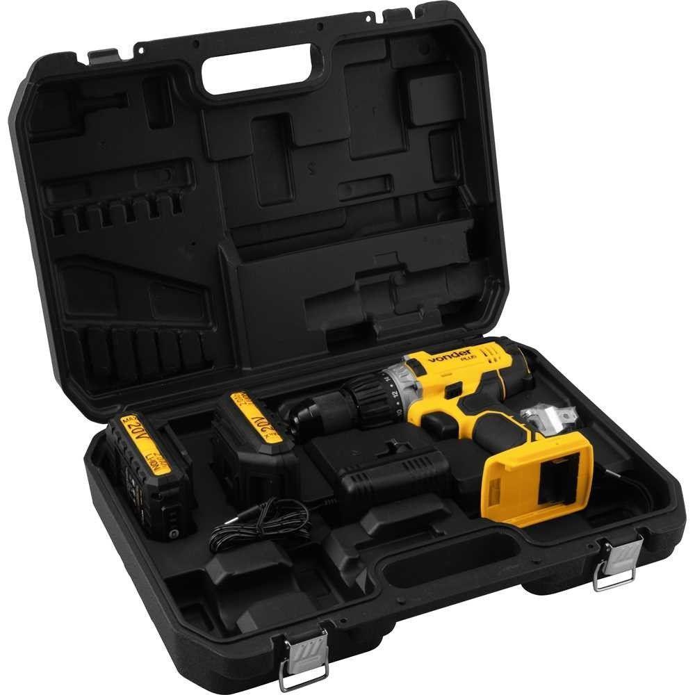 Furadeira Impacto Bateria 20V Biv Pfv 200i VonderConteúdo da Embalagem: 1 Parafusadeira/furadeira. Acompanha: 1 maleta, 2 baterias de 20 V e 1 fonte de carregamento bivolt automática.Leve, prática e portátil, possui regulagem para 16 posições de torque e velocidade variável (2 velocidades). Contém 3 funções de operação: parafusadeira, furadeira sem impacto e furadeira com impacto. Conta ainda com LED para melhor visibilidade do de trabalho, indicador de carga da bateria, cabo com revestimento emborrachado, proporcionando maior conforto ao operador, bateria de íons de lítio que confere alta eficiência de operação, além de fonte de alimentação bivolt automático com tensão de entrada de 100 V~ - 240 V~. Conta também com mandril metálico de aperto rápido, que facilita a troca rápida do acessório e sistema de travamento, possibilitando melhor fixação do acessório.Indicada para soltar e apertar parafusos e fazer furos em madeiras, metais e alvenaria.Garantia legal: 90 dias + Garantia contratual: 9 meses (Para locadoras, garantia única e exclusiva de 90 dias)Modelo: PFV 200IBateria: 20 V - 2,0 Ah - Íons de lítioTensão do carregador de bateria: 100 V~ - 240 V~ - Bivolt automáticoFrequência: 50 Hz/60 HzTipo de mandril: Aperto rápidoCapacidade do mandril: 1/2 - 13 mmSistema de : SimTipo de velocidade: Variável (2 velocidades)Rotações por minuto (rpm): 0 - 370/min / 0 - Impactos por minuto (ipm): 0 - Capacidade máxima de perfuração em aço: 13,0 mmCapacidade máxima de perfuração em madeira: 32,0 mmCapacidade de furação no concreto/alvenaria: 10,0 mmAceleração transmitida nas mãos - braços do operador - ah: 8,8 m/s²Incerteza da aceleração transmitida nas mãos - braços do operador - k: 1,5 m/s²Segue norma: ABNT NBR IEC 60745-1, ABNT NBR IEC 60745-2-1 e ABNT NBR IEC 60745-2-2Massa aproximada (peso): 1,65 kgAcessórios/peças que acompanham o produto: 1 maleta, 2 baterias de 20 V e 1 carregador bivolt automático Produto: Furadeira