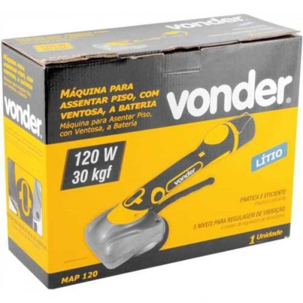 Máquina Assentar Piso Ventosa à Bateria 12V Map 120 VonderMarca: VonderConteúdo da embalagem: 1 Máquina de assentar piso com ventosa. Acompanha: 1 maleta plástica, 1 bateria 12 V e 1 fonte bivolt automático.Destaques e diferenciais:Equipamento prático e eficiente, tornando a instalação rápida. Possui grande poder de sucção e conta com 5 níveis para regulagem de vibração com identificação no display, proporcionando maior controle de acordo com a aplicação.Dicas de uso:Indicada para assentar porcelanatos e pisos em geral. Usar a ventosa somente em pisos com superfície lisa. Para pisos até 70 cm x 70 cm.Detalhes Técnicos:Capacidade de carga: 30 kgfPotência do motor: 120 W de vibrações por minuto (vpm): 1° nível: ; 2° nível: ; 3° nível: ; 4° nível: ; 5° nível: Tipo de bateria: Íons de Lítio 12V - 2,2 AhDimensões: 320 mm x 120 mm x 130 mm NA